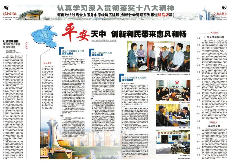 以加强和创新社会管理为统揽,以化解社会矛盾为主线,以解决影响社会和谐稳定的突出问题为突破口……今年以来,驻马店市在行业调解组织建设、矛盾排查调处网络建设、基层社会管理服务平台建设等方面进行了积极探索,初步形成了该市社会管理创新工作的特色和亮点,受到国务院和省委、省政府的充分肯定。目前,驻马店市已制定了《关于加强和创新社会管理创新实施意见》,提出了加强社会管理创新的目标任务、工作重点和具体措施。他们将把惠民利民作为社会管理创新的出发点和落脚点,加强与民生关系密切的社会管理项目建设,逐项制定规划,落实工作责任,明确目标任务,分步实施,分类指导,加大保障和建设力度,实现重点突破、整体推进。 详见8-10版 |