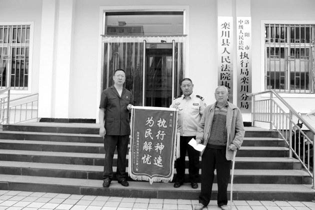 近日,一起侵权责任纠纷案件,经过栾川县法院执行法官的不懈努力,数次奔波于栾川和郑州之间,终于将赔偿款70余万元执行到位。执行案件申请人李某某的老父亲拄着拐杖将一面绣有“执行神速为民解忧”的锦旗送到执行法官手中。