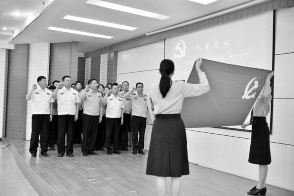 ▲日前,鹤壁市公安局组织开展“牢记使命跟党走,不忘初心立新功”主题党课活动。在该局局长罗锴(前排中)的领誓下,党员代表现场重温入党誓词。