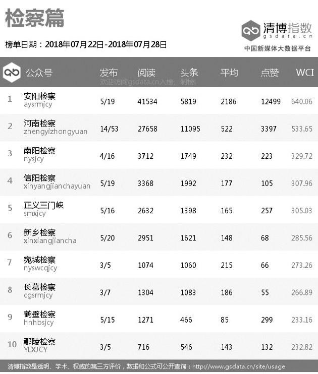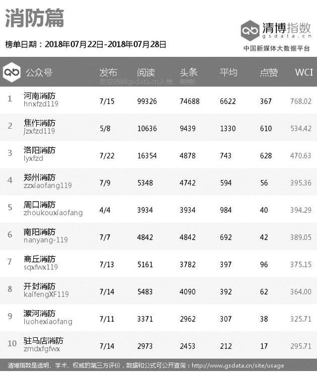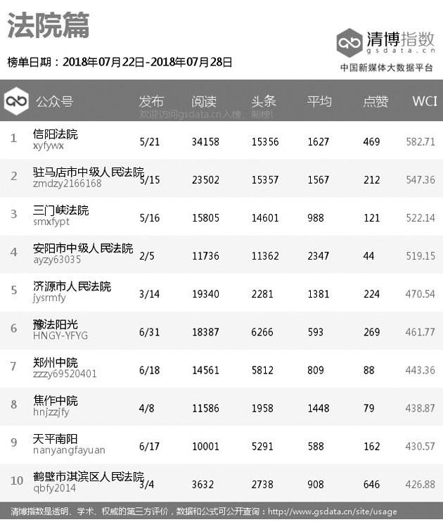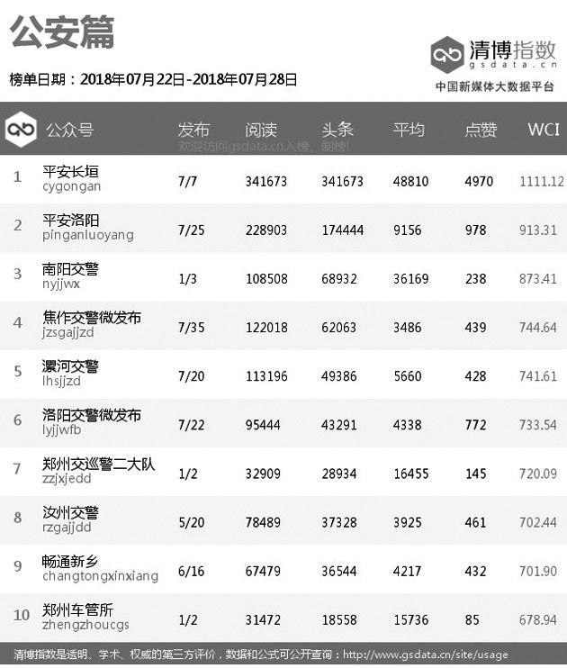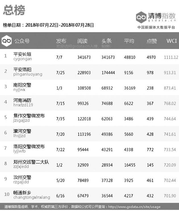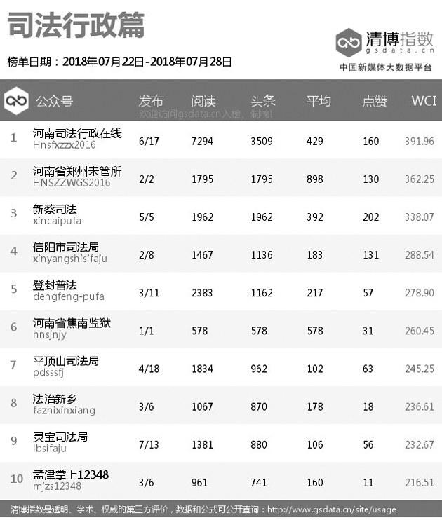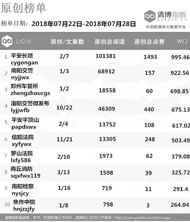 |  | | | 本期总榜变化较大,“平安长垣”虽然依旧排名第一,但阅读量较前几期有所降低。“平安洛阳”一鸣惊人,进步八个名次,排名第二,而且在各个指标上都缩小了与“平安长垣”的差距。“南阳交警”也表现不俗,时隔多期再次回归总榜,并取代“河南消防”位列第三。 |  | | | 本期原创榜单延续了上期百花齐放的形态,前三名分别属于“平安长垣”“南阳交警”和“郑州车管所”,此外,法院和消防系统也有公众号入围。“南阳检察”则代表检察系统挤掉了上期出现的“河南司法行政在线”在原创榜单中取得一席之地。 |  | | | “信阳法院”荣登法院系统榜单冠军,“驻马店市中级人民法院”“三门峡法院”分列第二、第三名。在法院热文榜单中,排名第一的是“三门峡法院”发布的《三门峡中院谁能C位出道?小编们快打起来啦!是时候请你出场了》,该文以投票的方式吸引粉丝参与其中,获得较高关注。 |  | | | 本期检察系统多家公众号阅读量大幅提高。“安阳检察”取代“河南检察”排名第一,其发布的《“时代先锋检察官”候选人事迹展播》系列文章也取代“河南检察”发布的检察好故事系列文章成为检察系统热文榜中最受关注的内容。 |  | | | “平安洛阳”凭借权威发布的《关于洛宁县“2018·7·15”放火案的情况通报》一文,斩获近10万的阅读量,在公安系统热文榜中超越“平安长垣”排名第一。“南阳交警”发布的《深度调查唐河、方城两起交通事故,相关人员被追责!》也获得大量关注。 |  | | | 本期司法行政系统榜单总阅读量有所减少。“河南司法行政在线”虽然四连冠,但整体热度下降了不少。“河南省郑州未管所”“新蔡司法”获得第二、第三名。 |  | | | 消防系统前三名是“河南消防”“焦作消防”和“洛阳消防”。“河南消防”在消防系统热文榜中占据九个席位,大多数文章都是关于高温提醒类的文章,根据当下热点并结合自身特点发布大众喜欢内容,一直是“河南消防”的拿手好戏。 |