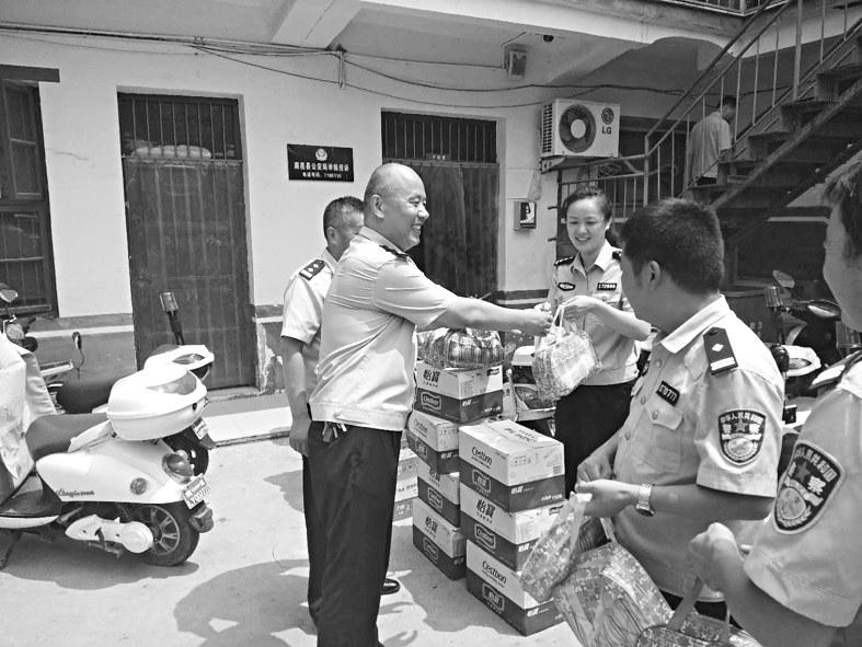 近日,鹿邑县公安局党委委员孙鑫仁代表局党委到卫真派出所,为坚守岗位奋战在高温一线的民警送去清凉与关怀。一线民警感谢局党委的关心与厚爱。
