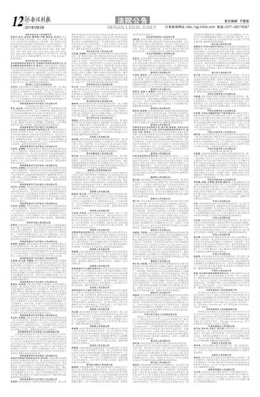 郑州市金水区人民法院公告李增玉、徐平、武凌子、靳清源、牛群、郁永全、刘玉松:关于本院少年庭移交的李增玉、徐平、武凌子、靳清源、牛群、郁永全、刘玉松犯非法吸收公众存款罪一案,本院作出的(2013)金刑初字第1546号刑事判决书已发生法律效力。你们未履行生效法律文书确定的义务,本院已立案执行。现依法向你们公告送达(2016)豫0105执4234、4235、4236、4237、4238、4239、4240、4241、4242、5832、5834、5835、5836、5837、5841、5842、5850号执行通知书、报告财产令、执行裁定书、执行决定书、限制高消费令,自公告之日起,经过60日即视为送达。 郑州市金水区人民法院公告郑州新油梆食品有限公司、河南健达投资担保有限公司、河南商联投资担保有限公司、夏忠义:本院受理原告中国建设银行股份有限公司郑州金水支行诉你们金融借款合同纠纷一案,现本院依法向你们公告送达起诉状副本、开庭传票、答辩通知书、举证通知书、康政监督卡,自公告发出之日起经过60日即视为送达,提交答辩状的期限和举证期限为公告期满后的15日内,本案定于举证期届满后的第三日上午9时(遇节假日顺延)在本院公开开庭审理,开庭地点见本院诉讼服务中心电子屏,逾期将依法缺席判决。 郑州市二七区人民法院公告田来凤:本院受理原告王瑞遵诉你民间借贷纠纷一案,现依法向你公告送达(2018)豫0103民初6421号起诉状副本、应诉通知书、举证通知书、开庭传票。自公告之日起经过60日即视为送达。提出答辩状的期限和举证期限分别为公告期满后的15日和30日。并定于举证期限届满后的第三个工作日上午9时(遇法定节假日顺延)在本院第405审判庭公开开庭审理此案,逾期将依法缺席裁判。 郑州高新技术产业开发区人民法院公告 (2018)豫0191民初3153号李军、徐金萍:本院受理原告河南丰之元汽车销售服务有限公司诉你修理合同纠纷一案,已审理终结,现依法向你公告送达本院(2018)豫0191民初3153号民事判决书。自本公告发出之日起60日内至河南省郑州高新技术产业开发区人民法院经济技术开发区中心法庭领取上述文书,逾期即视为送达。如不服本判决,可在公告送达次日起15日内,向本院递交上诉状,并按对方当事人的人数提出上诉状副本,上诉于河南省郑州市中级人民法院。逾期本判决即发生法律效力。 郑州高新技术产业开发区人民法院公告任宏亮、金雪梅、郑州宏腾气体有限公司:本院受理原告李晓诉你们民间借贷纠纷一案,已审理终结。现依法向你公告送达(2018)豫0191民初7668号民事判决书。自公告之日起60日内来本院高新技术产业开发区中心法庭领取民事判决书,逾期即视为送达。如不服本判决,可在公告期满后15日内,向本院递交上诉状及副本,上诉于河南省郑州市中级人民法院。逾期本判决即发生法律效力。 郑州高新技术产业开发区人民法院公告任宏亮、金雪梅:本院受理原告王国栋诉你们民间借贷纠纷一案,已审理终结。现依法向你公告送达(2018)豫0191民初7670号民事判决书。自公告之日起60日内来本院高新技术产业开发区中心法庭领取民事判决书,逾期即视为送达。如不服本判决,可在公告期满后15日内,向本院递交上诉状及副本,上诉于河南省郑州市中级人民法院。逾期本判决即发生法律效力。 郑州高新技术产业开发区人民法院公告任宏亮、金雪梅:本院受理原告任水全诉你们民间借贷纠纷一案,已审理终结。现依法向你公告送达(2018)豫0191民初7667号民事判决书。自公告之日起60日内来本院高新技术产业开发区中心法庭领取民事判决书,逾期即视为送达,如不服本判决,可在公告期满后15日内,向本院递交上诉状及副本,上诉于河南省郑州市中级人民法院。逾期本判决即发生法律效力。 郑州高新技术产业开发区人民法院公告任宏亮、金雪梅:本院受理原告陈富刚诉你们民间借贷纠纷一案,已审理终结。现依法向你公告送达(2018)豫0191民初7669号民事判决书。自公告之日起60日内来本院高新技术产业开发区中心法庭领取民事判决书,逾期即视为送达。如不服本判决,可在公告期满后15日内,向本院递交上诉状及副本,上诉于河南省郑州市中级人民法院。逾期本判决即发生法律效力。 郑州高新技术产业开发区人民法院公告任宏亮、金雪梅:本院受理原告王国宾诉你们民间借贷纠纷一案,已审理终结。现依法向你公告送达(2018)豫0191民初7671号民事判决书。自公告之日起60日内来本院高新技术产业开发区中心法庭领取民事判决书,逾期即视为送达。如不服本判决,可在公告期满后15日内,向本院递交上诉状及副本,上诉于河南省郑州市中级人民法院。逾期本判决即发生法律效力。 郑州市中级人民法院公告徐顺利:本院受理上诉人张莉因与被上诉人中国建设银行股份有限公司河南省分行、原审被告徐顺利金融借款合同纠纷一案,已审理终结。现依法向你公告送达(2018)豫01民终7525号民事判决书,判决内容如下:驳回上诉,维持原判。二审案件受理费4142元,由上诉人张莉负担。自公告之日起60日内来本院领取民事判决书,逾期则视为送达,本判决即发生法律效力。 郑州高新技术产业开发区人民法院公告李柏坤、尚含奇:本院受理原告郑州伟明汽车销售有限公司诉你们追偿权纠纷一案,现已审理终结。现依法向你们公告送达本院(2018)豫0191民初7936号民事判决书。限你们自公告之日起60日内来本院领