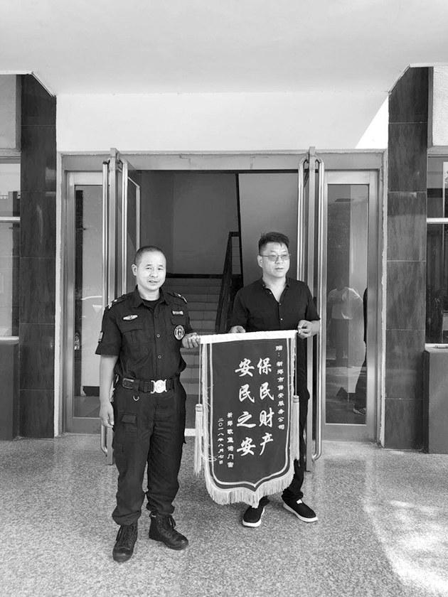 8月3日21时,新郑市保安服务公司“110”联网报警中心突然接到陶文路为民门窗店的报警信息,收到指令的公司技防部出警巡查中队5分钟内到达现场,发现店内浓烟滚滚,火势渐起,队员迅速拨打了“119”报警电话。因为发现及时,处置果断,使客户的损失降到了最低。近日,该商店负责人史卫民夫妇专程来到公司赠送锦旗表示感谢。