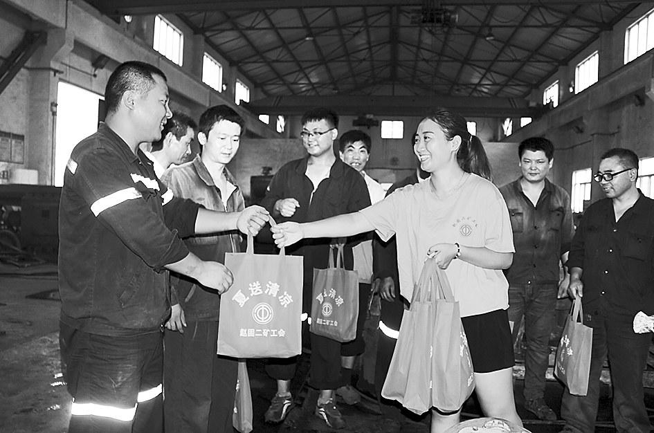为做好防暑降温工作,河南能源化工集团焦煤赵固二矿工会积极开展送清凉活动,为职工送去雪糕、凉茶、冰糖、毛巾、风油精等夏季防暑用品,并叮嘱他们做好防暑降温工作,受到了职工的一致好评。图为该矿女工在机修车间发放防暑用品。