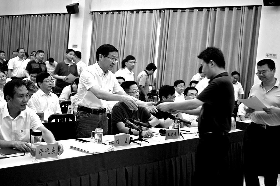 ▲各乡镇街区和县直单位主要领导向县委书记刘勇递交扫黑除恶履职承诺书