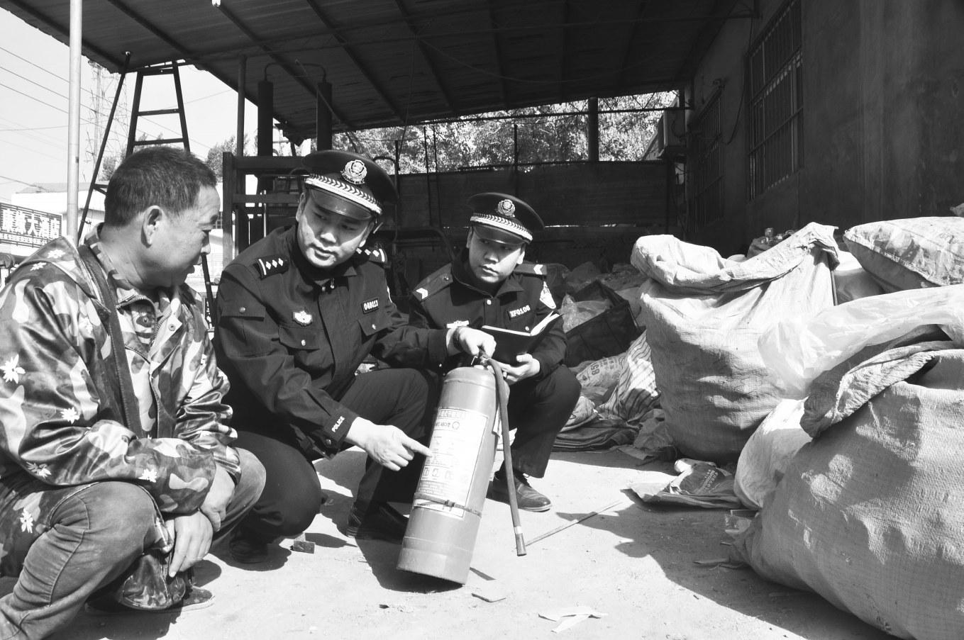 连日来,浚县公安局组织民警对辖区内大型超市、连锁店、加油站、废品收购站等重点单位的消防设施和消防器材开展秋季消防安全大检查。图为王庄派出所民警正在详细检查辖区内某废品收购站的消防情况。