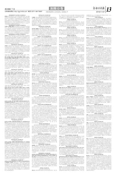 郑州高新技术产业开发区人民法院公告阎国文:本院受理原告王军萍诉你民间借贷纠纷一案,现依法向你公告送达起诉状副本、应诉通知书、诉讼权利义务风险告知书、举证通知书、告知审判庭组成人员通知书及开庭传票。自本公告发出之日起经过60日即视为送达。提出答辩状的期限为公告送达期满后的15日内,举证期限为公告期满后的30日内。并定于举证期满后的第3日上午9时(遇节假日顺延)在本院郑州高新技术产业开发区中心法庭公开开庭审理此案,逾期将依法缺席判决。 郑州高新技术产业开发区人民法院公告许国华、许雪峰、张蕾:本院受理原告王红志诉你们民间借贷纠纷一案,现依法向你们公告送达起诉状副本、应诉通知书、举证通知书、诉讼权利义务风险告知书、告知审判庭组成人员通知书及开庭传票。自公告之日起,经过60日即视为送达。提出答辩状的期限和举证期限分别为公告期满后15日和20日,并定于举证期满后第3日上午9时(遇法定节假日顺延)在本院527公开开庭审理,逾期将依法缺席裁判。 郑州高新技术产业开发区人民法院公告刘彦发:本院受理原告郑州万宁物业服务有限公司诉你物业服务合同纠纷一案,现依法向你公告送达(2018)豫0191民初16316号民事起诉状副本、应诉通知书、举证通知书、告知审判庭组成人员通知书、诉讼权利义务风险告知书及开庭传票。自本公告发出之日起经过60日即视为送达,提交答辩状和举证的期限为公告送达期满后的15日内,并定于举证期满后的第3日(遇节假日顺延)上午9时在本院民二庭公开审理此案,逾期将依法缺席判决。 郑州市金水区人民法院公告刘高产:本院受理原告中国平安财产保险股份有限公司诉你保险合同纠纷一案,已审理终结。现依法向你公告送达(2018)豫0105民初12441号民事判决书。限你自公告发出之日起60日内来本院领取判决书,逾期则视为送达,如不服本判决,可在公告期满后15日内向本院递交上诉状及副本10份,并交纳上诉案件受理费,上诉于河南省郑州市中级人民法院,逾期不上诉,本判决即发生法律效力。 郑州市金水区人民法院公告(2018)豫0105民初14897、14853、14856、14894、14846、14875、14863、14849、14837、14872、14884、14838号双云、张志超、苏华杰、马超、李濛、李国庆、王敬肖、王亭只、郭小雪、杨海顺、付爱鹏、周志蕾:本院受理原告中信银行股份有限公司信用卡中心郑州分中心诉你们信用卡纠纷一案,因你们下落不明,依照《中华人民共和国民事诉讼法》第九十二条之规定,现依法向你们公告送达(2018)豫0105民初14897、14853、14856、14894、14846、14875、14863、14849、14837、14872、14884、14838号民事判决书。自公告之日起60日内来本院领取民事判决书,逾期则视为送达。如不服本判决,可在公告期满15日内,向本院递交上诉状及副本,上诉于郑州市中级人民法院。逾期未上诉的,本判决即发生法律效力。 郑州市金水区人民法院公告(2018)豫0105民初14828、14890、14836、14844、14832、14860、14866、14834、14877、14887、14910号杨宝山、张丽、靳青云、刘成安、杨东辉、赵合林、龚砚果、李建华、毛国战、牛欣、安向光:本院受理原告中信银行股份有限公司信用卡中心郑州分中心诉你们信用卡纠纷一案,因你们下落不明,依照《中华人民共和国民事诉讼法》第九十二条之规定,现依法向你们公告送达(2018)豫0105民初14828、14890、14836、14844、14832、14860、14866、14834、14877、14887、14910号民事判决书。自公告之日起60日内来本院领取民事判决书,逾期则视为送达。如不服本判决,可在公告期满15日内,向本院递交上诉状及副本,上诉于郑州市中级人民法院。逾期未上诉的,本判决即发生法律效力。 郑州市金水区人民法院公告(2018)豫0105民初14881、14824、14842、14924、14922、14905、14900、14918、14913、14830、14839号郜燕东、董小金、焦卫礼、薛丰收、刘晓庆、常会文、王保保、杨延杰、齐玉兰:本院受理原告中信银行股份有限公司信用卡中心郑州分中心诉你们信用卡纠纷一案,因你们下落不明,依照《中华人民共和国民事诉讼法》第九十二条之规定,现依法向你们公告送达(2018)豫0105民初14881、14824、14842、14924、14922、14905、14900、14918、14913、14830、14839号民事判决书。自公告之日起60日内来本院领取民事判决书,逾期则视为送达。如不服本判决,可在公告期满15日内,向本院递交上诉状及副本,上诉于郑州市中级人民法院。逾期未上诉的,本判决即发生法律效力。 郑州市金水区人民法院公告 (2018)豫0105执11540号游学伟、游学敏、高三朝、车炳乾、河南圣都科贸有限公司、河南鼎盛实业有限公司:郑州市市郊农村信用合作联社庙李信用社申请执行你们金融借款合同纠纷一案,因以其他方式无法向你们送达法律文书,现依据《中华人民共和国民事诉讼法》第九十二条,向你们公告送达(2018)豫0105执11540号执行通知书、报告财产令、限制高消费令和执行裁定书,责令你们于本公告期满之日起3日内履行郑州市金水区人民法院(2017)豫0105民初9735号民事判决书所确定的义务,逾期未履行的,本院将依法对被执行人游学伟、游学敏、河南圣都科贸有限公司、河南鼎盛实业有限公司名下财产予以评估、拍卖。同时向你们公告送达到本院办理有关本案评估、评估报告送达、拍卖等执行过程中的有关事宜通知。你们应于公告期满之日起7日内到本院联系办理有