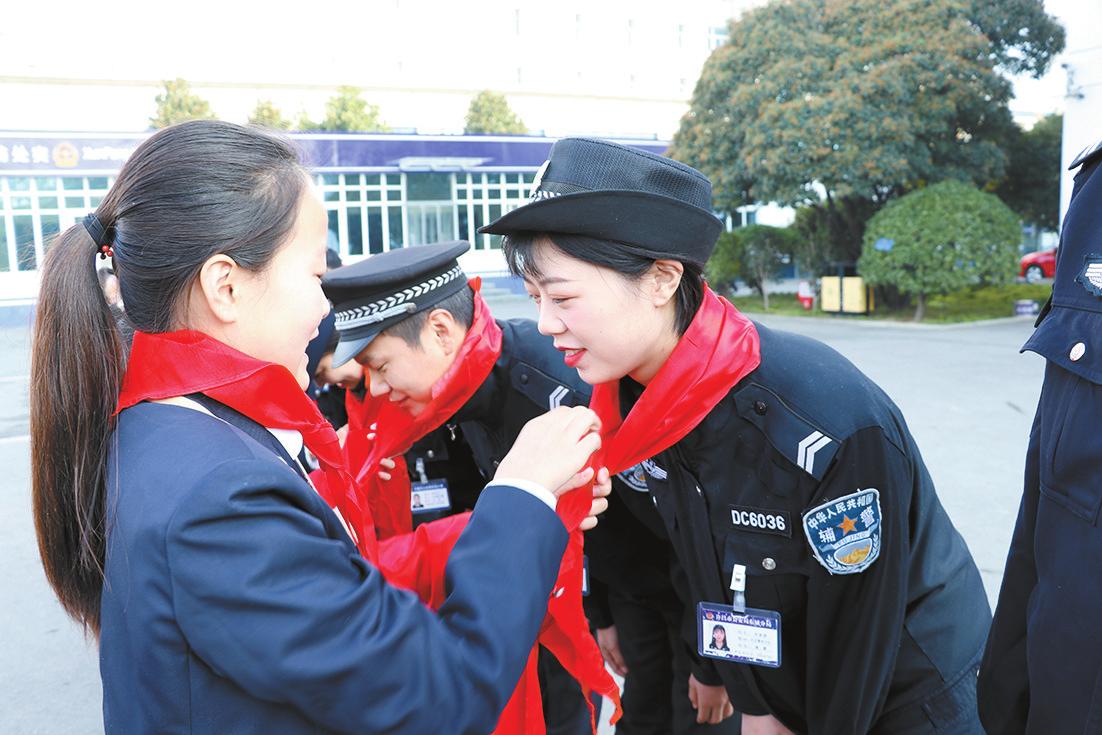 11月20日上午,许昌市新东街小学的师生代表走进许昌市公安局东城分局,同学们为社区警务大队护学岗的民警、辅警叔叔阿姨佩戴红领巾,以表达对他们的感激之情。近年来,该警务大队为该校设立护学岗,风里雨里不曾间断,严寒酷暑不曾停歇,确保了校园和师生的安全。河南法制报记者胡斌通讯员靳鑫摄影报道