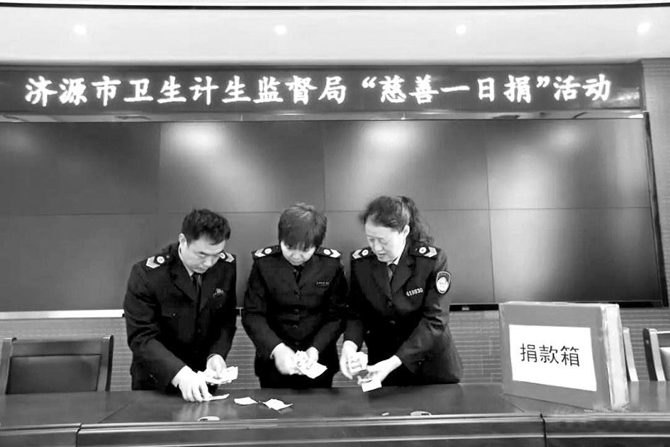 ?近日,济源市卫生计生监督局开展了“慈善一日捐”活动,全体干部职工踊跃捐款。此次捐款将由专人负责接收、登记和公示,交至济源市慈善总会统一管理,捐助给需要帮助的困难家庭。