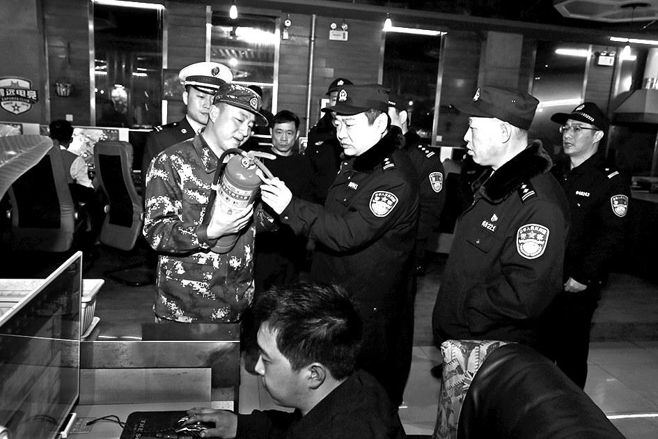 连日来,淇县公安局全警出动,在全县范围内开展了以加强公共娱乐场所、商场等部位社会面治安防控,严防发生爆炸、火灾、拥挤等重大治安灾害事故和重大恶性案件为重点的治安防控集中行动。图为民警在一网吧检查消防设施。