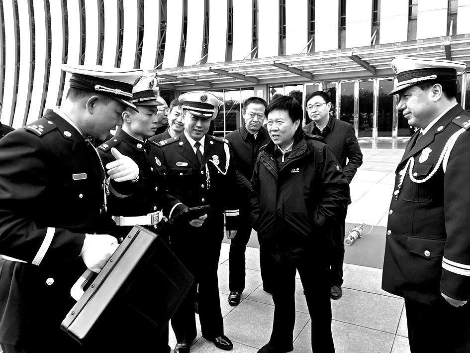 2018年12月29日上午,平顶山市举行全市消防救援队伍迎旗授衔和换装仪式。平顶山市委书记周斌,市委常委、秘书长杨克俊,市委常委、常务副市长摆向阳,市委常委、政法委书记邓志辉,市军分区司令员陈卫等出席仪式。图为周斌等人参观全市消防救援队伍装备展示。河南法制报记者陈亚洲通讯员李红锋摄影报道