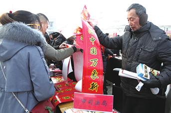 1月10日上午,由许昌市委宣传部牵头主办,许昌市司法局积极参加的许昌市文化科技卫生“三下乡”集中示范活动,在许昌市建安区陈曹乡南北街社区举行。图为书法家们向群众赠送法治春联。