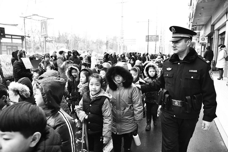 ▲为加强和规范校园周边安全,许昌市公安局魏都分局坚持实行“护学岗”制度,全力保障广大学生上下学出行安全。图为该分局北大派出所民警坚守“护学岗”。河南法制报记者胡斌通讯员曹秀军摄影报道