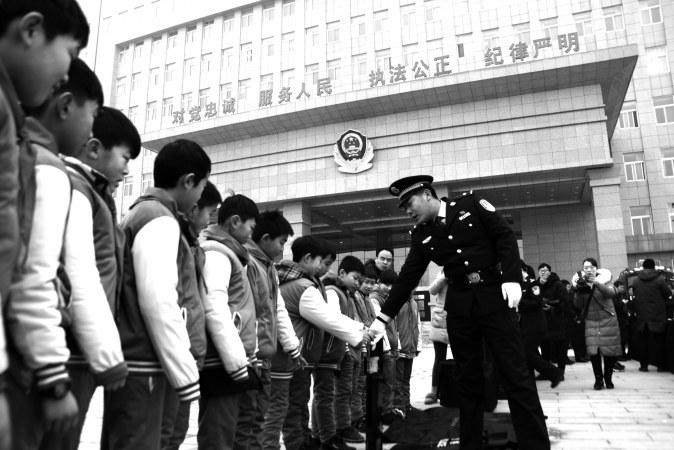 近日,汝南县公安局举行了“警营开放日”活动,邀请辖区部分小学生、市民、人大代表、政协委员等来到公安局参观、体验,通过展示警用装备、讲解枪支知识、发放宣传单,让大家近距离接触公安文化。图为民警在向小学生讲解警用装备常识。 邓倩茹摄影报道