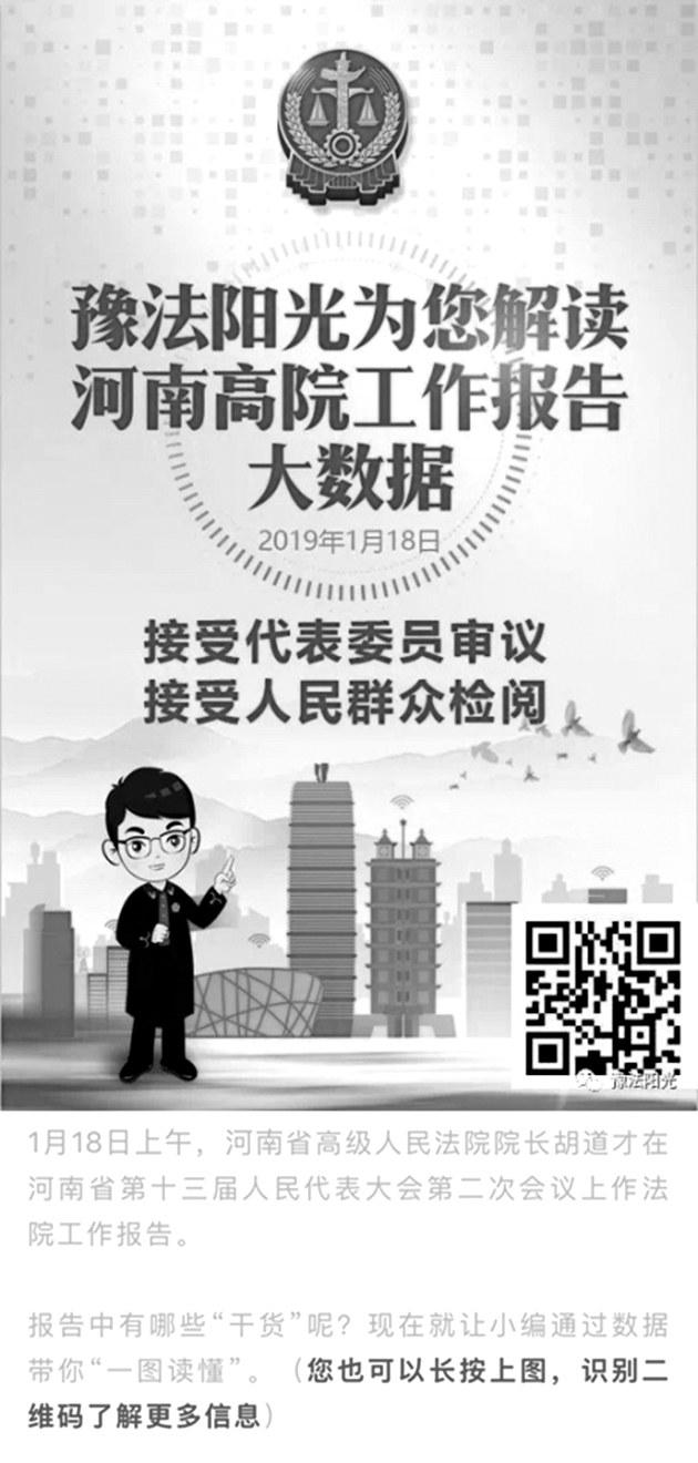 河南两会刚刚闭幕,其间河南众多新媒体纷纷发力,通过多种形式报道两会议程、看点、动向等内容。而这其中,让人无法忽视的是河南省高级人民法院和河南省人民检察院这两家的新媒体平台@豫法阳光和@河南检察,他们一个拼速度,一个拼厚度,通过图文、直播、H5、小视频等多种形式,展示着自己在两会报道中的独特魅力。 @豫法阳光: 拼速度 第一时间图解法院工作报告 1月18日,在河南省十三届人大二次会议第二次全体会议上,河南省高级人民法院院长胡道才作法院工作报告。如何让网友第一时间了解法院的工作呢?@豫法阳光可谓是拼手速的典范。 1月18日9时5分,在新浪微博上,@豫法阳光微博就发布了一条预告消息,称胡道才作法院工作报告时,@豫法阳光微博将全程图文直播。 随后,@豫法阳光微博刷屏,以图文解读的形式推送了河南省高级人民工作报告。很多网友纷纷留言:“聚焦两会,为河南法院点赞!” 不仅微博发力,当天,@豫法阳光微信更是比其微博早一点推出了图解版的河南省高级人民法院工作报告,主题是用大数据解读各项法院工作。 除了微博微信的快速推出,当天,@豫法阳光微博、微信还推送了一个二维码,网友扫描这个二维码,看到的是另一种形式的H5版法院工作报告。 速度快、形式多,让我们看到了@豫法阳光作为官方新媒体,正充分发挥和利用着自身天然的优势。 @河南检察: 拼厚度 系列文章扫描检察工作 @豫法阳光微博在1月18日直播了法院工作报告,@河南检察微博随后也直播了河南省人民检察院检察长顾雪飞作检察院工作报告的情形。与@豫法阳光微博做法不同的是,@河南检察微博直播时,发布了更多现场的图片,使网友如临现场,更受网友欢迎。 然而,@河南检察的最大亮点在于,@河南检察早在两会开始之初,就通过微信发布【河南两会看检察】等系列文章,全面展示一年来的检察工作,拼的可谓是厚度。 1月14日至17日,@河南检察微信分别推出【河南两会看检察】四篇系列文章——服务大局篇、队伍建设篇、扫黑除恶篇和公益诉讼篇,以及《邀您来看——2018河南检察足迹》和《邀您来审——河南检察2018年工作答卷》两篇文章。其中,《邀您来看——2018河南检察足迹》链接H5产品,通过一个个时间节点,展现出2018年河南检察留下的一个个足迹。《邀您来审——河南检察2018年工作答卷》则通过图文晒出了2018年河南检察工作的成绩单。 这些文章会不会与两会上的河南检察工作报告重复? 答案是没有!1月18日,@河南检察微信也推出了图文版的河南检察工作报告解读。看了报告解读我们发现,@河南检察微信此前推出的系列文章,与河南检察工作报告相互补充,更加全面地展示了河南检察的各项工作。 不仅如此,1月18日,@河南检察微信还推出了视频作品《邀您围观——4分钟带您走过河南检察这一年》,更是受到网友欢迎。网友@有谁共鸣留言称:“2分51秒出现照片那一刻太震撼了!”网友@一剪梅留言称:“你们是怎么做到的呢?太棒了。” 1月19日,@河南检察微信又推出了【河南两会看检察】系列的第七篇文章——代表委员热议篇,为@河南检察在河南两会期间的报道画上圆满句号。