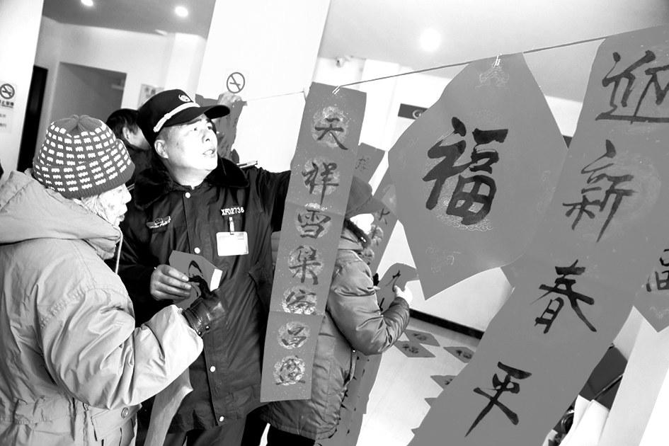 近日,郑州市中原区绿东村街道巡防队员在辖区开展“喜迎新春”义务写春联活动,给大家送去新春问候。河南法制报记者宁晓波 通讯员郭建勇摄影报道