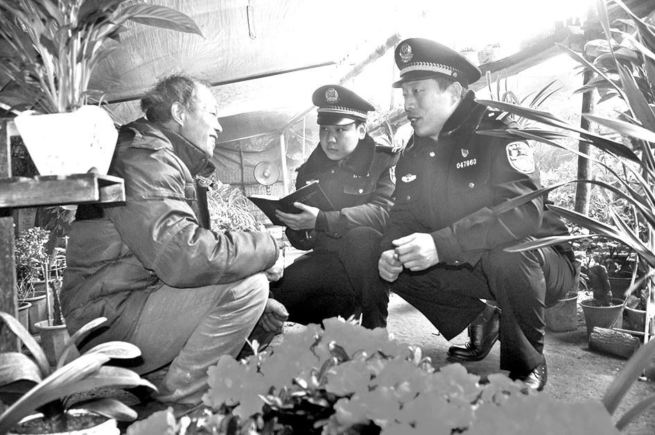 连日来,浚县公安局王庄派出所开展“向人民报告”大走访活动,广泛征求社会各界对公安工作的意见和建议。图为1月28日民警走访花卉大棚种植户。