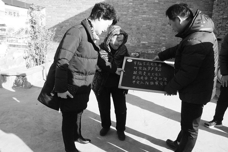 1月22日,沁阳市纪委监察委的领导干部到该市西苟庄村,为80岁的低保户朱玉琴老人送去节日祝福与慰问金等节礼。老人在黑板上写下了感激的话语。