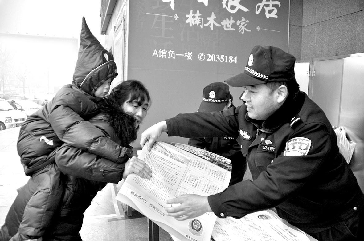 新春佳节临近,连日来,新乡南桥警方开展“禁止燃放烟花爆竹,共创文明绿色家园”集中宣传活动。图为民警向群众发放《致全市居民的一封信》,宣传禁止燃放烟花爆竹政策。 河南法制报记者穆黎明通讯员张培全摄影报道