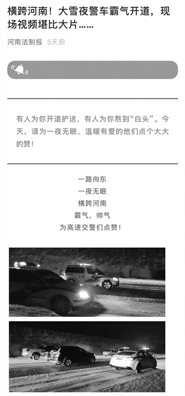 近期,河南冰雪天气不断,给人们的出行带来诸多不便。为保障大家平安、顺利出行,这些天,我省诸多政法单位用各种方式守护在大家身边,并利用新媒体展示出来,令许多人看过之后感觉暖心不已。 下面,我们就来看看河南各政法单位各种“霸气”“坚守”“唠叨”的爱的守护。 “霸气”守护——史无前例,震撼人心 一夜无眠,千里接力,河南高速警车开道,雪夜护送庞大壮观车队平安过境。2月14日19时,@河南高速公安、@河南法制报等发布的关于该事件的文章恐怕是近期冰雪天气里最“霸气”的守护。2月13日下午开始,大雪袭中原,很多跨省返程人员途经连霍高速河南段前往东南沿海省份,却因大雪滞留在连霍高速三门峡段。为防止发生长时间、长距离的车辆滞留,防止发生群众冻伤等意外事件,河南省公安厅高速交警总队果断决定,沿途8个高速交警支、大队联合高速路政大雪夜500多公里接力,一夜无眠,警车开道护送数千辆汽车平安驶离河南!“告白”守护——一直坚守,从未远离 冰雪有时候也代表了浪漫,于是许多人会选择在下雪天进行告白。然而,最长情的告白不是“我爱你”,而是“我在”。当遇到这种天气时,@漯河公安、@漯河市交警秩序管理示范大队把握机会,分别通过微信公众号发布了来自漯河警察的“告白”。是的,无论什么时候,“我都在”。那两天大雪,出行不便,交警们指挥交通、推车、扫雪、帮扶出行人群……仿佛只要你需要,他们就在你的身边。 类似的告白方式还有很多。如@郑警蜀黍的一篇《最美不是下雪天 而是雪中坚守的他们》,呈现的是郑州警察坚守的身影。@郑州市政法综治的一篇《大雪纷飞中,奋战在一线的身影,最美!》,呈现出郑州市政法综治人在大雪中坚守的身影。 然而,你以为只有警察会玩告白吗?不,还有法院人、司法行政人等。例如,@豫法阳光发布了《风雪中那道道暖心的身影》,讲的就是法官们在风雪中清扫街道、办理案件的故事。