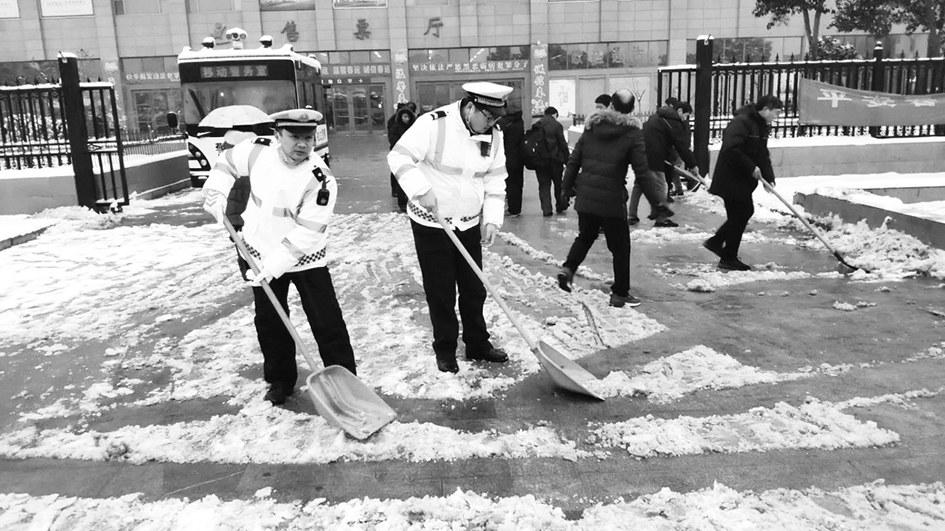 |  | | | 民警在清扫积雪(图片来自@郑警蜀黍) |  | | | |
