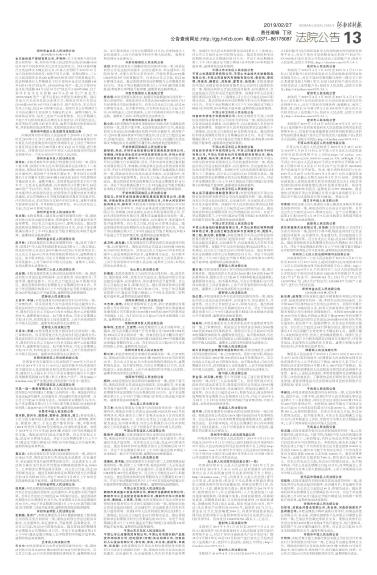郑州市金水区人民法院公告 (2019)豫0105执915号金庄盛世资产管理有限公司、罗艳丽:关于史利明与你们借款合同纠纷一案,郑州市中级人民法院作出的(2018)豫0105民终9677号民事判决书已经发生法律效力。你们未按时履行生效法律文书确定的义务,申请人史利明于2019年01月10日向本院申请执行,本院于同日立案。审理过程中,二七区人民法院作出的(2016)豫0103民初5257号民事裁定书,依法将被执行人罗艳丽名下位于郑州市金水区花园路144号6层01号(产权证号:1201010716)房产一套,位于郑州市金水区花园路144号6层10号(产权证号:1101071084),位于郑州市金水区花园路144号6层09号(产权证号:1101071042)房产一套予以查封,并移送至本院处理。因以其他方式无法向你送达法律文书,现依法向你公告送达(2019)豫0105执915号执行通知书、财产报告令,本公告自发布之日起,经过60日即视为送达。限你们自公告期满后3日内自动履行生效法律文书确定的义务。逾期不履行,本院将依法评估、拍卖上述房产以清偿债务。自公告期满之日起7日内到本院联系办理有关本案评估、评估报告送达、拍卖等执行过程中的有关事宜,逾期不到视为放弃相应权利,并承担相应的法律责任,本院将依法执行本案。 郑州市中原区人民法院司法拍卖公告 河南省郑州市中原区人民法院将于2019年3月28日10时至2019年3月29日10时止(延时的除外)在河南省郑州市中原区人民法院淘宝网司法拍卖网络平台上对位于郑州市中原区冉屯北路13号28号楼1单元21层61号房屋,进行拍卖活动。详情请关注郑州市中原区人民法院淘宝网司法拍卖网络平台。户名为:郑州市中原区人民法院。 郑州市金水区人民法院公告谢艳红:本院受理时华申请执行你借款合同纠纷一案,因你下落不明,依照《中华人民共和国民事诉讼法》第九十二条的规定,现依法向你公告送达本院(2018)豫0105执12827号执行通知书、报告财产令和执行裁定书。责令你自公告期满后3日内履行本院(2018)豫0105民初20671号民事判决书确定的义务。逾期不履行,本院将依法对你名下位于郑州市二七区齐礼阎西路南、兴华南街西3号楼2单元24层2403房产予以评估、拍卖。同时向你公告送达本院办理有关本案评估、拍卖报告送达、拍卖等执行过程中的有关事宜的通知,自公告期满10日内到本院联系办理有关本案评估、评估报告送达、拍卖等执行过程中的有关事宜,逾期不到视为放弃相应权利,并承担相应法律责任。本公告自发出之日起,经过60日即视为送达。 郑州市金水区人民法院公告张志强:本院受理秦上超诉张志强民间借贷纠纷一案,现依法向你公告送达起诉状副本、答辩通知书、举证通知书及开庭传票等。自公告之日起经过60日,即视为送达。提出答辩状和举证期限均为公告期满后的15日内,并定于举证期限满后第3日上午9时(遇法定节假日顺延)在本院开庭审理。逾期将依法缺席裁判。 郑州市金水区人民法院公告赵丰林:本院受理原告石琳诉你离婚纠纷一案,因你下落不明,依照《中华人民共和国民事诉讼法》第九十二条之规定,现依法向你公告送达(2019)豫0105民初6号民事判决书。自公告之日起60日内来本院领取民事判决书,逾期则视为送达。如不服本判决,可在公告期满15日内,向本院递交上诉状及副本,上诉于郑州市中级人民法院。逾期未上诉的,本判决即发生法律效力。 郑州市二七区人民法院公告闰会娟:本院受理原告张玉清诉你民间借贷纠纷一案,现依法向你公告送达起诉状副本、应诉通知书、举证通知书、开庭传票、廉政监督卡。自公告之日起经过60日即视为送达。提出答辩状和举证的期限为公告期满后的15日内。并定于举证期满后的第3日上午9时(遇法定节假日顺延)在本院202审判法庭公开开庭审理,逾期将依法缺席裁判。 武陟县人民法院公告王彦冲、李婕:本院受理原告何盼妮诉你们合同纠纷一案,已审理终结。因采用其他方式无法向你们送达裁判文书,现依法向你们公告送达(2018)豫0823民初3531号民事判决书,限你们自公告之日起60日内来本院沁南中心法庭领取判决书,逾期则视为送达。如不服本判决,可在公告期满之日起15日内,向本院递交上诉状及副本,上诉于河南省焦作市中级人民法院。逾期本判决即发生法律效力。 武陟县人民法院公告王彦冲、李婕:本院受理原告张方园诉你们合同纠纷一案,已审理终结。因采用其他方式无法向你们送达裁判文书,现依法向你们公告送达(2018)豫0823民初3535号民事判决书,限你们自公告之日起60日内来本院沁南中心法庭领取判决书,逾期则视为送达。如不服本判决,可在公告期满之日起15日内,向本院递交上诉状及副本,上诉于河南省焦作市中级人民法院。逾期本判决即发生法律效力。 许昌市建安区人民法院拍卖公告 河南省许昌市建安区人民法院将于2019年3月30日10时至2019年3月31日10时止(延时的除外)在河南省许昌市建安区人民法院淘宝网司法拍卖网络平台上公开拍卖:被执行人王福永名下位于许昌市建安区瑞贝卡大道中段南侧南苑新城12号楼1单元1楼东户房产。网址:http://sf.taobao.com资产处置法院:河南法院-许昌市-建安区 许昌市建安区人民法院公告许昌一加一面粉有限公司:本院受理河南晶业城市建设集团有限公司诉你建设工程施工合同纠纷一案。现依法向你公告送达起诉状副本、应诉通知书、举证通知书及开庭传票。自公告之日起60