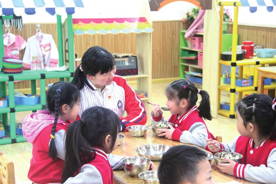 3月27日,郑州市二七区建新街幼儿园园长王品和后勤部副主任张娟与幼儿共同用餐,观察幼儿的用餐情况,填写陪餐记录,及时发现并解决幼儿集中用餐中存在的问题。
