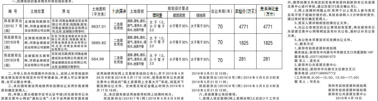 经新郑市人民政府批准,郑州市自然资源和规划局、新郑市自然资源和规划局决定以网上挂牌方式出让三宗国有建设用地使用权。现将有关事项公告如下:一、挂牌地块的基本情况和规划指标要求: