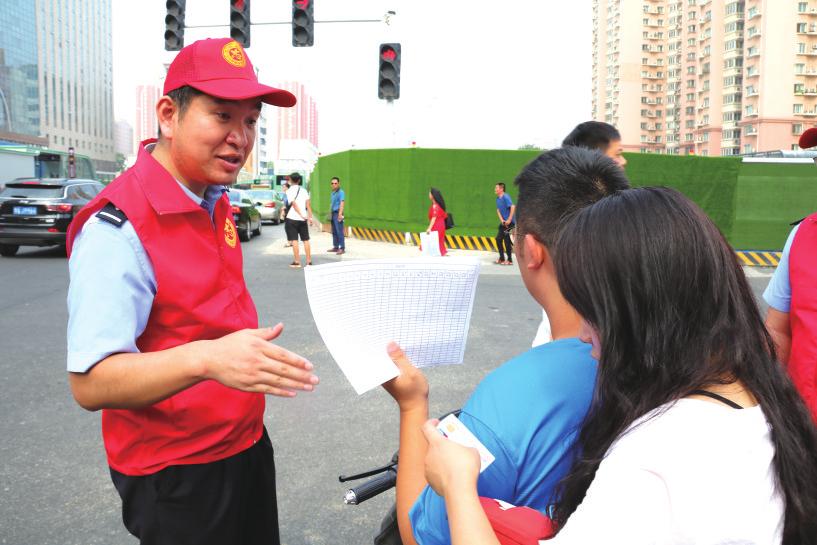 7月16日上午,郑州市公安局丰产路分局组织开展文明交通志愿活动,民警身穿红马甲走上街头,引导行人过马路走斑马线、看信号灯。