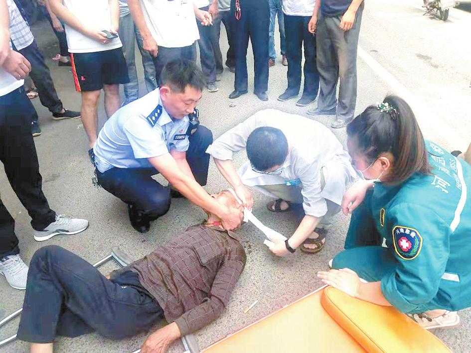 民警协助医务人员进行救治(图片由现场群众提供) 本报三门峡讯(河南法制报记者马建刚通讯员李旭鸽葛宇芳)“大爷,您醒醒!快,赶紧联系医院。”7月17日下午,灵宝市公安局朱阳派出所民警张松林和王一民成功救助在卖菜过程中突然晕倒的张老汉,受到了在场群众的一致好评和张老汉家人的感谢。 当天,该所值班室接到报警称有一老汉摔倒在街道上,头部受伤。放下电话,民警紧急赶到朱阳镇金屏路百货大楼路旁,发现一位70多岁的老汉躺在地上,头部受伤出血,身边的车上还有一些蔬菜,身边无人看护。两名民警立即分头行动,疏导过往车辆和围观群众、了解现场情况、紧急拨打120……工作有条不紊地开展。120救护车到达现场后,民警帮助医护人员对老人头部进行了简单包扎,并将其抬上救护车送往医院。 据悉,张老汉是该市五亩乡人,在朱阳镇租房子居住,以贩卖蔬菜为生,因连日高温导致身体不适,不慎晕倒。清醒后的老人和赶到医院的家属对民警和医护人员的救助连声表示感谢。 |