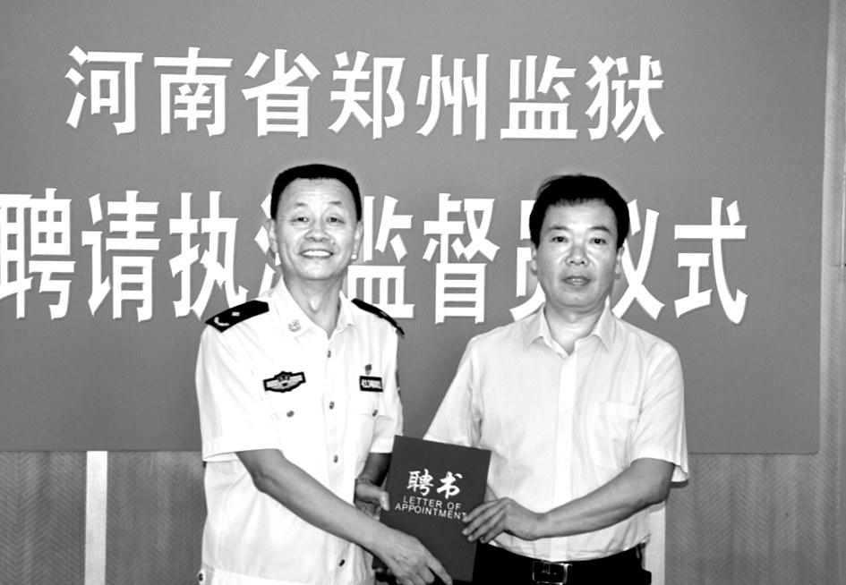 ?近日,省郑州监狱举行新一届执法监督员聘任仪式,聘请包括新密市政法委常务副书记刘军在内的10名同志为监狱执法监督员。图为该监狱党委书记、监狱长朱永海为执法监督员颁发聘书。