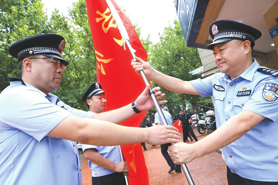 为进一步做好第十一届全国少数民族传统体育运动会各项安保工作,8月14日下午,郑州市公安局东风路分局举行全国少数民族传统体育运动会安保誓师大会。图为现场庄严授旗。