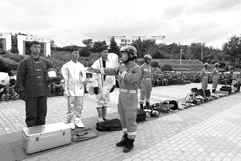 ▲为进一步增强师生的消防安全意识,提升学校抗御火灾的能力,日前,平顶山市消防救援支队联合平顶山学院举行了“消防进军训”主题宣传活动,该学院6000余名军训新生参加了活动。图为消防员向同学们介绍消防装备。河南法制报记者陈亚洲通讯员李红锋摄影报道