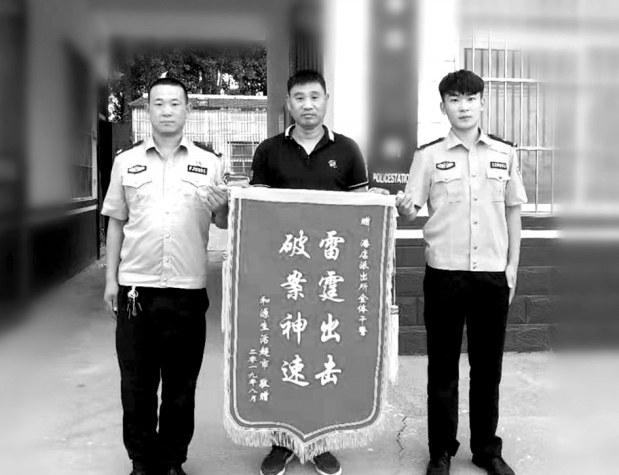 近日,封丘县潘店镇一超市负责人将一面印有“雷霆出击破案神速”字样的锦旗送到封丘县公安局潘店派出所民警手中,体现了“纪律作风建设提升年”活动成效。河南法制报记者穆黎明通讯员进昌摄影报道