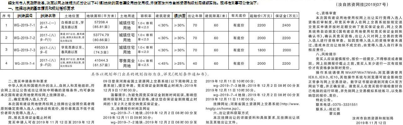 汝州市国有建设用地使用权出让网上挂牌公告