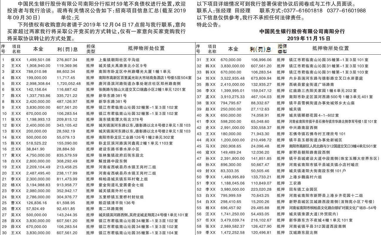 中 国 民 生 银 行 股 份 有 限 公 司 南 阳 分 行资产招商暨处置公告