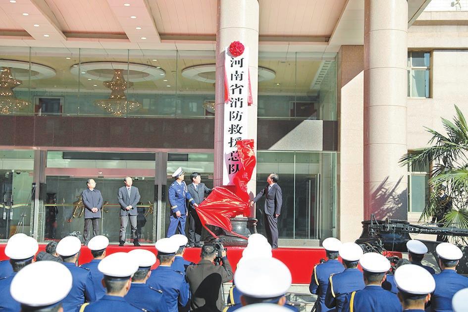 昨日,河南省消防救援总队正式挂牌。副省长刘伟为河南省消防救援总队揭牌并讲话。省应急管理厅厅长吴忠华,省消防救援总队党委书记、政治委员李文江,省委编办、省财政厅、省人社厅、省退役军人事务厅有关负责人,省消防救援总队党委班子成员、总队机关和郑州市消防救援支队指战员代表等参加挂牌仪式。河南法制报记者王园园通讯员 张珊珊摄影报道