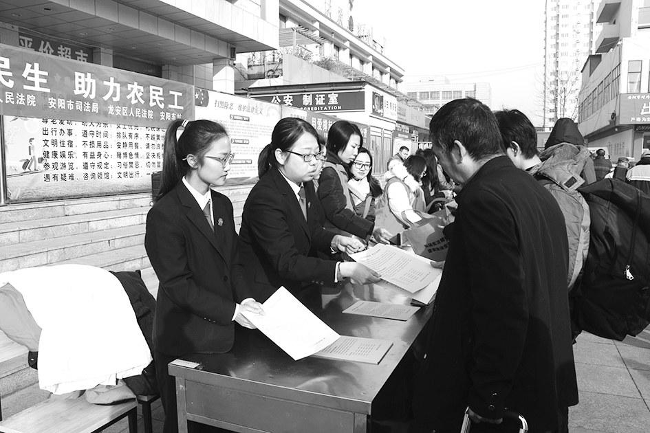 近日,在农民工返乡过节之际,安阳市龙安区法院组织干警到火车站广场开展了农民工法律服务宣传活动,提高农民工的法律风险防范意识和依法维权能力。