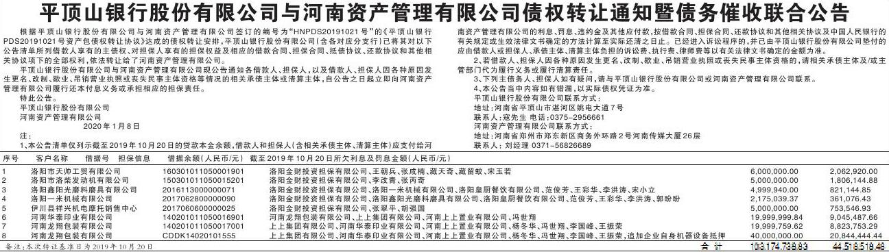 平顶山银行股份有限公司与河南资产管理有限公司债权转让通知暨债务催收联合公告