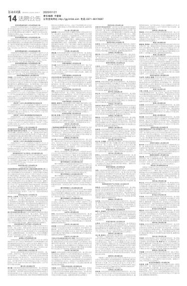 郑州市管城回族区人民法院拍卖公告 河南省郑州市管城回族区人民法院将于2020年1月31日10时起至2020年2月1日10时止(延时的除外)在河南省郑州市管城回族区人民法院淘宝网司法拍卖网络平台上对:东风雪铁龙牌2014款小型轿车一辆进行公开拍卖活动,详情请关注网址:http://sf.taobao.com/0371/08,户名:郑州市管城回族区人民法院。 郑州市管城回族区人民法院拍卖公告 河南省郑州市管城回族区人民法院将于2020年2月7日10时起至2020年2月8日10时止(延时的除外)在河南省郑州市管城回族区人民法院淘宝网司法拍卖网络平台上对位于郑州市管城回族区港湾路1号院金色港湾49号楼5单元8层东北户房产进行公开拍卖活动,详情请关注网址:http://sf.taobao.com/0371/08,户名:郑州市管城回族区人民法院。 郑州市管城回族区人民法院拍卖公告 河南省郑州市管城回族区人民法院将于2020年2月25日10时起至2020年2月26日10时止(延时的除外)在河南省郑州市管城回族区人民法院淘宝网司法拍卖网络平台上对位于郑州市管城回族区豫丰街1号23号楼4单元5层504号房产进行公开拍卖活动,详情请关注网址:http://sf.taobao.com/0371/08,户名:郑州市管城回族区人民法院。 郑州市管城回族区人民法院拍卖公告 河南省郑州市管城回族区人民法院将于2020年2月5日10时起至2020年2月6日10时止(延时的除外)在河南省郑州市管城回族区人民法院淘宝网司法拍卖网络平台上对位于郑州市中原区桐柏路98号帝湖花园A区帝湖王府3号楼29层东侧L号房产进行公开拍卖活动,详情请关注网址:http://sf.taobao.com/0371/08,户名:郑州市管城回族区人民法院。 郑州市管城回族区人民法院公告井晓盼:本院受理原告广发银行股份有限公司郑州银基支行诉被告夏少华与你金融借款合同纠纷一案,已审结。现依法向你们公告送达(2019)豫0104民初9566号民事判决书,自公告发出之日起60日内来郑州市文兴路15号南曹法庭领取民事判决书,逾期即视为送达。如不服本判决,可在公告送达期满后15日内向本院南曹法庭递交上诉状及副本,上诉于郑州市中级人民法院。逾期本判决即发生法律效力。 郑州市二七区人民法院网络司法拍卖公告 河南省郑州市二七区人民法院将于2020年3月1日10时至2020年3月2日10时止(延时的除外)在河南省郑州市二七区人民法院淘宝网司法拍卖网络平台上(网址:http://sf.taobao.com/0371/11),依法公开拍卖河南新密农村商业银行股份有限公司233280股股权和河南荥阳农村商业银行股份有限公司389160股股权,户名:(郑州市二七区人民法院)进行公开拍卖活动。 郑州市二七区人民法院网络司法拍卖公告 河南省郑州市二七区人民法院将于2020年3月1日10时至2020年3月2日10时止(延时的除外)在河南省郑州市二七区人民法院淘宝网司法拍卖网络平台上(网址:http://sf.taobao.com/0371/11),依法公开拍卖位于新郑市龙湖镇维也纳湖畔21幢1单元9层904号,户名:(郑州市二七区人民法院)进行公开拍卖活动。 郑州市二七区人民法院网络司法拍卖公告 河南省郑州市二七区人民法院将于2020年3月1日10时至2020年3月2日10时止(延时的除外)在河南省郑州市二七区人民法院淘宝网司法拍卖网络平台上(网址:http://sf.taobao.com/0371/11),依法公开拍卖位于郑州市二七区东汝河路3号楼1单元15号,户名:(郑州市二七区人民法院),进行公开拍卖活动。 郑州市二七区人民法院公告河南新密农村商业银行股份有限公司股东、河南荥阳农村商业银行股份有限公司股东:关于本院执行的王晓红申请执行张喜鹏、马柯借款合同纠纷一案,本院依法查封马柯名下持有河南荥阳农村商业银行股份有限公司389160股、持有河南新密农村商业银行股份有限公司233280股。现本院将依法处置上述股权,自本院发布此公告起20日内向本院申请行使优先购买权,逾期则视为放弃优先购买权。 郑州市二七区人民法院网络司法拍卖公告 河南省郑州市二七区人民法院将于2020年3月1日10时至2020年3月2日10时止(延时的除外)在河南省郑州市二七区人民法院淘宝网司法拍卖网络平台上(网址:http://sf.taobao.com/0371/11),依法公开拍卖位于郑州市二七区福寿街88号2号楼7层725号,户名:(郑州市二七区人民法院)进行公开拍卖活动。 郑州高新技术产业开发区人民法院拍卖公告 河南省郑州高新技术产业开发区人民法院将于2020年2月9日10时起至2020年2月10日10时止(延时的除外)在郑州高新技术产业开发区人民法院淘宝网司法拍卖网络平台上对车牌号为豫E4944W号江铃牌小型汽车进行公开拍卖活动(详情请见网址:http://sf.taobao.com/0371/13,部分页面上法院简称为“开发区”)。 郑州市金水区人民法院公告 (2015)金执字第6200号河南省得邦利达家俱有限公司、河南吉通物流有限公司:白书英与你们民间借贷纠纷案,本院作出(2014)金民二初宇第4017号民事调解书已发生法律效力。因你们未履行生效法律文书确认的还款义务,权利人白书英于2015年11月6日向本院申请执行,本院同日立案。现依法向你们公告送达(2015)金执字第6200号执行通知书、财产报告令、限制消费令和执行裁定书,自公告之日起,经过60日即视为送达。限你们自公告期满后3日内,自动履行金钱给付义务。逾期不履行,本院依法将对你们限制高消费,并对河南吉通物流有限公司名下位于浚县善堂镇东风路东侧(浚国用:20130088)的土地及地上建筑物进行评估、拍卖。限你们于本公告期满之日15日内到本院