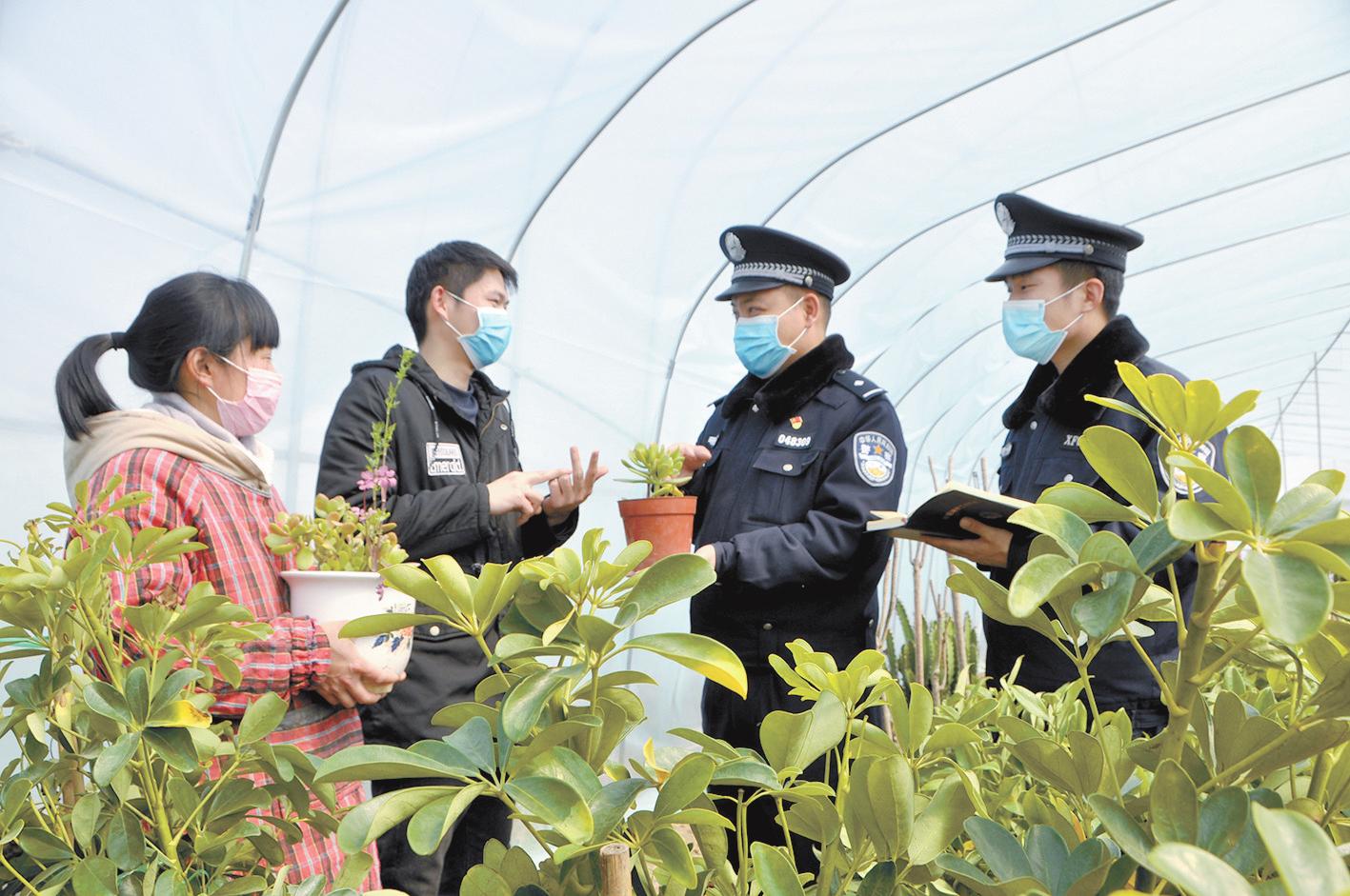 连日来,浚县公安局新镇派出所组织民警深入辖区,倾听防疫期间群众心声,了解群众诉求,力保平安稳定和有序复工复产。图为3月7日,民警到花卉大棚里走访群众。