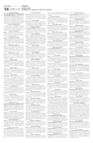 郑州市金水区人民法院公告李跃红、郭鹏辉、柴建新、谢运生、李秋娥、曹红星、王科、秦兰青、郑州市臻豪鸿兴贸易有限公司、郑州金源热镀锌有限公司、河南鼎兴投资担保有限公司:本院受理李帅诉郑州银行股份有限公司李跃红、郭鹏辉、柴建新、谢运生、李秋娥、曹红星、王科、秦兰青、郑州市臻豪鸿兴贸易有限公司、郑州金源热镀锌有限公司、河南鼎兴投资担保有限公司案外人执行异议之诉一案,现依法向你们公告送达起诉状副本、答辩通知书、举证通知书及开庭传票等。自公告之日起经过60日,即视为送达。提出答辩状和举证期限均为公告期满后的15日内,并定于举证期限满后第3日9时40分(遇法定节假日顺延)在本院开庭审理。逾期将依法缺席裁判。 郑州市二七区人民法院拍卖公告 河南省郑州市二七区人民法院将于2020年4月15日10时起至2020年4月16日10时止(延时的除外)在河南省郑州市二七区人民法院淘宝网司法拍卖网络平台上对位于郑州市二七区新圃东街1号院7号楼2单元27号(产权证号:0302001707)房产进行公开拍卖活动,详情请关注网址:http://sf.taobao.com/0371/11,户名:郑州市二七区人民法院。 郑州市二七区人民法院公告徐国强:关于本院执行的程永成申请执行王洪波、陈建飞民间借贷纠纷一案,本院依法查封了王洪波名下位于郑州市二七区新圃东街1号院7号楼2单元27号房产。现本院将依法处置上述房产,自本院发布此公告起20日内向本院申请行使优先购买权,逾期则视为放弃优先购买权。 驻马店市驿城区人民法院公告魏惠喜:本院受理原告寇东燕诉你民间借贷纠纷一案,已审结,因你下落不明,现依法向你公告送达本院(2019)豫1702民初11561号民事判决书。自本公告发出之日60日内来本院香山法庭领取民事判决书,逾期即视为送达。如不服本判决,可在公告期满之日起15日内向本院递交上诉状及副本并预交上诉费,上诉于驻马店市中级人民法院。逾期本判决既发生法律效力。 驻马店市驿城区人民法院公告曾庆云:本院受理原告河南省昌建建筑工程有限公司诉你追偿权纠纷一案,已审结,现依法向你公告送达本院(2019)豫1702民初13020号民事判决书。自本公告发出之日60日内来本院香山法庭领取判决书,逾期即视为送达。如不服本判决,可在公告期满之日起15日内向本院递交上诉状及副本并预交上诉费,上诉于驻马店市中级人民法院。逾期本判决即发生法律效力。 开封市顺河回族区人民法院公告张战杰:本院受理的原告陈岩诉你民间借贷纠纷一案,已审结。现依法向你公告送达本院(2019)豫0203民初1499号民事判决书。自公告之日起60日内来本院领取民事判决书,逾期则视为送达。如不服本判决,可在公告期满后15日内,向本院递交上诉状及副本,上诉于开封市中级人民法院。逾期本判决即发生法律效力。 临颍县人民法院公告王正(曾用名王郑一):本院受理漯河市第一概念装饰材料有限公司诉你买卖合同纠纷一案,已审结。现依法向你公告送达(2019)豫1122民初3821号民事判决书。自发出公告之日起60日内来本院城郊法庭领取民事判决书,逾期则视为送达。如不服本判决,可在公告期满后15日内,向本院递交上诉状及副本,上诉于漯河市中级人民法院,逾期本判决即发生法律效力。 临颍县人民法院公告李大涛:本院受理张瑞萍诉你离婚纠纷一案,已审结。现依法向你公告送达(2019)豫1122民初3412号民事判决书。自发出公告之日起60日内来本院城郊法庭领取民事判决书,逾期则视为送达。如不服本判决,可在公告期满后15日内,向本院递交上诉状及副本,上诉于漯河市中级人民法院,逾期本判决即发生法律效力。 潢川县人民法院公告张清龙、魏明霞:本院受理原告河南潢川农村商业银行股份有限公司诉你二人、李旭贞、陈桂琴民间借贷纠纷一案,现已审结。因你二人下落不明,现向你公告送达(2019)豫1526民初3837号民事判决书,本院判决你二人于本判决书生效后十日内一次性偿还原告河南潢川农村商业银行股份有限公司借款本金9万元及利息、罚息(按双方在借款合同中约定的利率,自2015年12月3日起计算至款清之日止);被告李旭贞对上述债务承担连带清偿责任。自本公告发出之日起经过60日即视为送达。如不服本判决,可在本判决书送达之日起十五日内,向本院递交上诉状,并按对方当事人的人数或者代表人的人数提出副本,上诉于信阳市中级人民法院。 潢川县人民法院公告严长秀:本院受理原告李严章诉你扶养纠纷一案,现已审结。因你下落不明,现向你公告送达(2019)豫1526民初4360号民事判决书,本院判决驳回原告李严章的诉讼请求。自本公告发出之日起经过60日即视为送达。如不服本判决,可在本判决书送达之日起十五日内,向本院递交上诉状,并按对方当事人的人数或者代表人的人数提出副本,上诉于信阳市中级人民法院。 潢川县人民法院公告严长秀:本院受理原告李严章诉你扶养纠纷一案,现已审结。因你下落不明,现向你公告送达(2019)豫1526民初4360号民事判决书,本院判决驳回原告李严章的诉讼请求。自本公告发出之日起经过60日即视为送达。如不服本判决,可在本判决书送达之日起十五日内,向本院递交上诉状,并按对方当事人的人数或者代表人的人数提出副本,上诉于信阳市中级人民法院。 平顶山市中级人民法院公告平顶山市金灿机械制造有限公司、平顶山市明达特种热镀锌