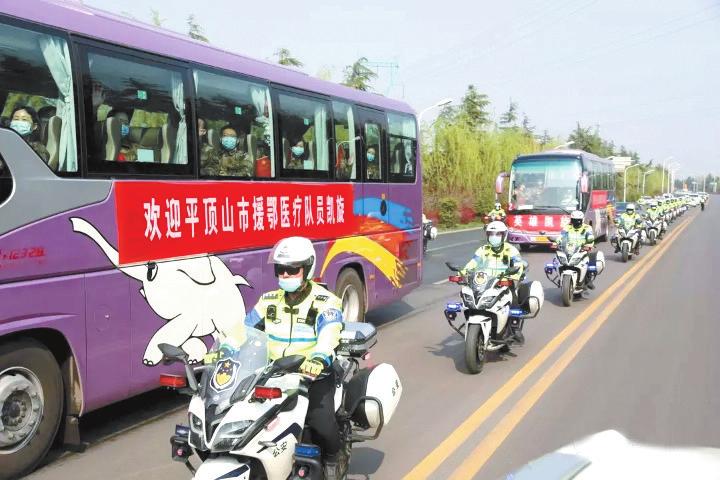 3月24日,平顶山市援助湖北的49名白衣勇士不辱使命平安归来,平顶山交警在高速下站口迎接英雄凯旋,铁骑护卫队把他们平安护送到目的地。 赵彦伟摄影报道