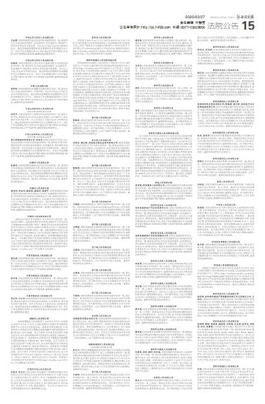 平顶山市卫东区人民法院公告王金英:本院受理原告汤会民诉你民间借贷纠纷一案,现向你们公告送达起诉状副本、应诉通知书、举证通知书、风险提示、权利义务须知及开庭传票。自公告之日起,经过60日即视为送达。提出答辩状的期限和举证期限均为公告期满后15日内。并定于举证期满后第3日9时(遇法定节假日顺延)在本院310号审判庭开庭审理,逾期将依法缺席判决。 平顶山市卫东区人民法院公告杜锋军:本院受理原告平顶山市中天物流有限公司诉你民间借贷纠纷一案,现向你们公告送达起诉状副本、应诉通知书、举证通知书、风险提示、权利义务须知及开庭传票。自公告之日起,经过60日即视为送达。提出答辩状的期限和举证期限均为公告期满后15日内。并定于举证期满后第3日9时(遇法定节假日顺延)在本院310号审判庭开庭审理,逾期将依法缺席判决。 叶县人民法院公告郭梦柯:本院受理原告朱晓鹏与你婚约财产纠纷一案,依法向你公告送达起诉状副本、开庭传票。本公告自发出之日起,经过60日即视为送达。提交答辩状的期限和举证期限均为公告送达期满后的15日内。本院定于举证期限届满的第3日9时(遇法定节假日顺延)在本院任店人民法庭公开开庭审理此案,逾期将依法缺席裁判。 平顶山市新华区人民法院公告 (2019)豫0402民初4775号徐亚平:本院受理原告王丽婷诉你民间借贷纠纷一案,因你下落不明,现依法向你公告送达起诉状副本、应诉通知书、举证通知书及开庭传票。自公告发出之日起经过60日即视为送达。提出答辩状和举证的期限均为公告期满后的15日。并定于举证期满后第3日8时30分(遇法定节假日顺延)在本院民事审判庭306公开开庭审理,逾期将依法缺席判决。 平顶山市新华区人民法院公告 (2019)豫0402民初4823号鲁山县惠城商贸有限公司、李争光:本院受理原告平顶山市元登实业有限公司诉你们民间借贷纠纷一案,因你们下落不明,现依法向你公告送达起诉状副本、应诉通知书、举证通知书及开庭传票。自公告发出之日起经过60日即视为送达。提出答辩状和举证的期限均为公告期满后的15日。并定于举证期满后第3日8时30分(遇法定节假日顺延)在本院民事审判庭306公开开庭审理,逾期将依法缺席判决。 长葛市人民法院公告张森杰:本院受理原告陈新业诉你买卖合同纠纷一案,因本院向你直接送达和邮寄送达无果,现依法向你公告送达起诉状副本、应诉通知书、举证通知书及开庭传票,自公告之日起,经过60日即视为送达。提出答辩状的期限和举证期限均为公告期满后的15日内,并定于举证期满后第3日9时(遇法定节假日顺延)在本院民事二庭(第五审判庭)公开开庭审理,逾期将依法缺席判决。 长葛市人民法院公告杨鸿杰、郑会玲、耿新建、唐建玲、耿建中:本院受理原告河南长葛农村商业银行股份有限公司诉你们金融借款合同纠纷一案,因本院向你们直接送达和邮寄送达无果,现依法向你们公告送达起诉状副本、应诉通知书、举证通知书及开庭传票,自公告之日起,经过60日即视为送达。提出答辩状的期限和举证期限均为公告期满后的15日内,并定于举证期满后第3日9时(遇法定节假日顺延)在本院民事二庭(笫五审判庭)公开开庭审理,逾期将依法缺席判决。 长葛市人民法院拍卖公告 本院在执行赵中套与张焕芳、乔会军买卖合同纠纷一案,在执行过程中,本院依法委托有关机构对被执行人乔会军名下的豫KWF763别克牌小轿车一辆进行评估并在淘宝网司法拍卖平台进行公开拍卖,现将有关事宜公告如下:拍卖标的物:豫KWF763别克牌小轿车一辆。该标的物的所有权人:乔会军。评估价格为44804元,经合议起拍价38083.4元作为保留价进行公开司法拍卖,保证金3800元,竞拍增价幅度为每次400元。与本案拍卖财产有关的担保物权人或者其他优先权人应于拍卖日前经法院确认后到淘宝网司法拍卖平台报名参与竞买,届时未报名的,视为放弃优先购买权。其他参与竞买的单位和个人需要了解详情直接登录我院淘宝网司法拍卖平台(http://sf.taobao.com.户名;长葛市人民法院)。 许昌市建安区人民法院公告黄志强:本院受理原告杨付铭诉你民间借贷纠纷一案,现依法向你公告送达起诉状副本、应诉通知书、举证通知书及开庭传票。自本公告发出之日起经过60日即视为送达。提出答辩状及举证期限均为公告期满后的15日内,并定于举证期满后的第3日9时在本院长村张法庭公开开庭审理,逾期将依法裁决。 许昌市建安区人民法院公告桓书伟:本院受理原告孙莉娜诉你离婚纠纷一案,现依法向你公告送达起诉状副本、应诉通知书、举证通知书及开庭传票。自本公告发出之日起经过60日即视为送达。提出答辩状及举证期限均为公告期满后的15日内,并定于举证期满后的第3日9时30分在本院长村张法庭公开开庭审理,逾期将依法裁决。 许昌市建安区人民法院公告高红军、孔小华:本院受理原告李长中诉你们民间借贷纠纷一案,现依法向你们公告送达起诉状副本、应诉通知书、举证通知书及开庭传票。自本公告发出之日起经过60日即视为送达。提出答辩状及举证期限均为公告期满后的15日内,并定于举证期满后的第3日10时在本院长村张法庭公开开庭审理,逾期将依法裁决。 鄢陵县人民法院公告 河南省鄢陵县人民法院将于2020年4月29日10时起至2020年4月30日10时止(延时的除外)在淘宝网司法拍卖