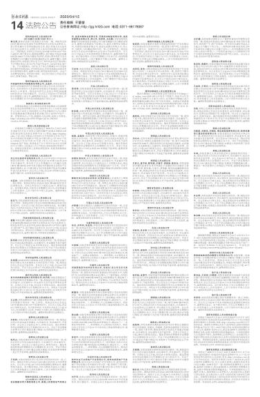 郑州市金水区人民法院公告 (2019)豫0105执10661号之一郭玉贤:董荣字诉郭玉贤借款合同纠纷一案,本院作出的(2019)豫0105民初6841号民事判决书已经发生法律效力。郭玉贤未履行生效判决确定的义务,因以其他方式无法向你们送达法律文书,依照《中华人民共和国民事诉讼法》第九十二条的规定,向你们公告送达(2019)豫0105执10661号执行通知书、财产报告令、限制高消费令、执行裁定书及(2019)豫0105执10661号之执行裁定书(评估、拍卖),责令你们于本公告期满后3日内履行生效判决确定的义务,逾期不履行,本院将依法评估、拍卖郭玉贤在名下位于郑州市金水区任砦北街1号2号楼6单元3层142号(不动产权证号:1201271413)房产一套。予以清偿债务。你们应当于本公告期满后10日内到本院办理评估机构选定、评估报告送达、拍卖机构选定及拍卖等执行程序相关事宜,逾期不办理,视为放弃相关权利。由此产生的费用及损失,均有你们承担。本公告自发出之日起,经过60日,即视为送达。特此公告。 郑州市金水区人民法院公告河南盛利祥汽车销售服务有限公司、王进京:本院在执行李奋阳与河南盛利祥汽车销售服务有限公司买卖合同纠纷一案中,因申请执行人李奋阳向本院提交书面追加王进京为被执行人申请书。现依法向你们公告送达本院(2020)豫0105执异41号执行裁定书。自公告之日起60日内来本院执行局领取上述文书,逾期则视为送达。如不服本裁定,可在公告期满后15日内向本院提起执行异议之诉。 临颍县人民法院变卖公告 河南省临颍县人民法院将在河南省临颍县人民法院阿里巴巴司法拍卖网络平台上于2020年5月1日10时至2020年6月30日10时止(延时除外)公开变卖被执行人闫占涛所有的临颍县城关镇金地名郡A幢3单元A3193号房产一套。详情请关注:(户名:临颍县人民法院,法院主页网址:https://sf.taobao.com/0395/05?spm=a213w.3065169.courtList.436.JaSrit)。 睢县人民法院拍卖公告 河南省商丘市睢县人民法院定于2020年5月15日10时至2020年5月16日10时止(延时的除外)在商丘市睢县人民法院淘宝网司法拍卖网络平台上(网址:http//sf.taobao.com,户名:商丘市睢县人民法院)公开拍卖张云芝名下位于郑州市管城区果园路35号院20号楼2单元1层0101(产权证0024311)和35号院20号楼1单元1层0103(产权证0056605)房产两处、张清体名下位于郑州市金水区丰庆路69号3号楼1-2层商业1号(产权证1201262295)房地产一处。详细信息请登录上述网址浏览查询,有意者请按网站公布要求参加竞买。 商丘市梁园区人民法院公告商丘市弘盛建材销售有限公司:孙龙印申请执行你商品房销售合同纠纷一案,现依法向你送达(2019)豫1402执4219号执行裁定书,责令你于本公告期满后3日内履行本院(2019)豫1402执4219号执行裁定书所确定的义务将位于弘盛壹号城邦小区1号楼2单元703号房屋的产权证书办理至申请人孙龙印名下,自公告之日起,经过60日即视为送达。逾期不履行的,本院将依法强制执行。 孟州市人民法院公告刘孟安:本院受理原告李红旗诉被告刘孟安买卖合同纠纷一案已审结。现依法向你公告送达(2020)豫0883民初22号民事判决书。自本公告发出之日起经过60日,即视为送达。如不服本判决,可在本公告期满后15日内,向本院递交上诉状及副本,上诉于焦作市中级人民法院。逾期本判决即发生法律效力。 焦作市马村区人民法院公告张闫飞:本院受理原告郝志强与被告张闫飞民间借贷纠纷一案,已审结。现依法向你公告送达(2020)豫0804民初40号民事判决书。自公告之日起,经过60日则视为送达。如不服本判决,可在判决书送达之日起15日内,向本院提交上诉状,并按对方当事人的人数或者代表人的人数提出副本,上诉于焦作市中级人民法院。逾期本判决即发生法律效力。 开封市顺河回族区人民法院公告曹震:本院受理孔德国申请执行你民间借贷纠纷一案,本院作出的(2019)豫0203民初993号民事判决书已发生法律效力。现依法向你公告送达本院(2020)豫0203执119号执行通知书、报告财产令、执行裁定书法律文书,自公告之日起,经过60日即视为送达。限你自公告期满3日内自动履行生效法律文书确定的义务,逾期不履行的,本院将依法强制执行。 开封市顺河回族区人民法院公告陈伟丽:本院受理袁益林诉你民间借贷纠纷一案,现依法向你公告送达起诉状副本、应诉通知书、举证通知书及开庭传票。自公告之日起经过60日即视为送达。提出答辩状的期限和举证期限为公告期满后的15日内,并定于举证期满后的第3日9时(遇法定节假日顺延)在本院2号法庭开庭审理,逾期将依法缺席判决。 开封市金明区人民法院公告朱格策(410205197611292032):本院受理原告中国农业银行股份有限公司开封城西支行诉你信用卡纠纷一案,现依法向你公告送达开庭传票。自发出公告之日起,经过60日即视为送达。并定于送达后第3日9时(遇法定假日顺延)在本院第四审判庭公开开庭审理,逾期将依法缺席判决。 焦作市山阳区人民法院公告焦作市白桦林装饰工程有限公司、刘天跃:本院受理原告王加亮诉你股东资格确认纠纷一案,现依法向你公告送达起诉状副本、应诉通知书、举证通知书及开庭传票等诉讼材料。自发出公告之日起,经过60日即视为送达。提出答辩状和举证的期限为公告期满后的15日内。本院定于举证期限届满后第3日8时30分(遇法定假日顺延)在本院四号审判庭公开开庭审理此案,逾期将依
