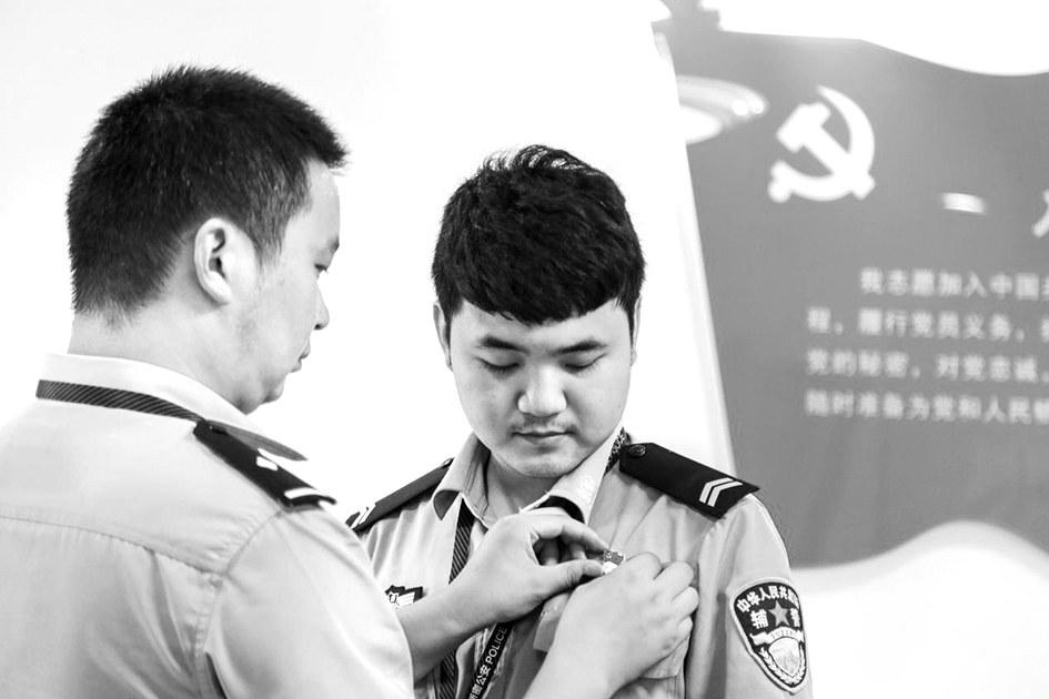 ?7月1日,新密市纪委监委驻市公安局纪检组为新入党的公安民警举行入党仪式。图为老党员为新党员佩戴党徽。