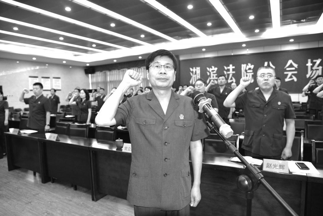 ▲6月29日,三门峡市湖滨区法院开展“秉初心心向党”庆七一系列活动。图为该院党组书记、院长党立新带领党员干警重温入党誓词。