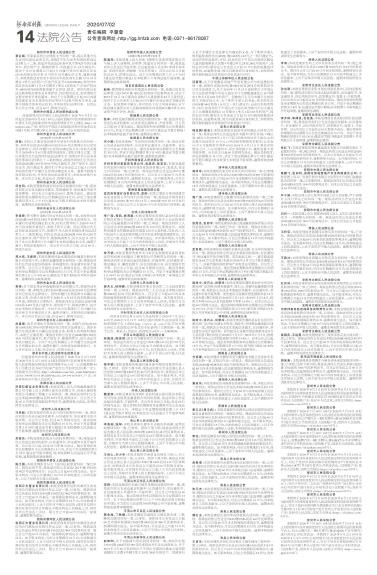 郑州市中原区人民法院公告蔡红斌:李荣泉诉你公证债权文书纠纷一案,因以其他方式无法向你送达法律文书,依据《中华人民共和国民事诉讼法》第九十二条,依法向你送达(2015)中执字第829号执行通知书、报告财产令、限制消费令、风险提示书、执行裁定书,限你于本公告期满之日起5日内履行郑州市惠济公证处(2015)郑惠证执字第13号执行证书确定的义务,逾期未履行,本院将依法对你名下郑州市中原区冉屯北路13号19号楼东1单元5层西户(不动产权证号:1001095698)、郑州市中原区冉屯北路13号19号楼东1单元1层西北户(不动产权证号:1001095703)的两套房屋予以评估、拍卖。同时向你公告送达到本院办理有关本案评估、评估报告送达、拍卖等执行过程中的有关事宜通知。你应于公告期满之日起10日内到本院联系有关本案评估拍卖等执行过程中的有关事宜,逾期不到视为放弃相应权利,并承担相应法律后果。自发出本公告之日起,经过60日,即视为送达。 郑州市中原区人民法院拍卖公告 河南省郑州市中原区人民法院将于2020年8月5日10时起至2020年8月6日10时止(延时的除外)在河南省郑州市中原区人民法院淘宝网司法拍卖网络平台上(网址:http://sf.taobao.com,户名:郑州市中原区人民法院)对郑州市金水区东风路1号院17号楼3单元35号进行第一次公开拍卖活动。 郑州市金水区人民法院公告 (2020)豫0105执5096号薛健:本院已立案受理沈朝华申请执行你借款合同纠纷一案,本院作出的(2019)豫0105民初416号民事判决书已经发生法律效力,你们未履行生效判决确定的义务,权利人沈朝华于2020年5月6日到本院申请执行,本院于同日立案。因以其他方式无法向你们送达法律文书,依照《中华人民共和国民事诉讼法》第九十二条的规定,现依法向你们公告送达本院(2020)豫0105执5096号执行通知书、财产报告令、执行决定书、执行裁定书,限你们于本公告送达之日起5日内向本院报告财产并履行生效判决确定的义务。逾期不到视为放弃相应权利,并承担相应的法律责任,本院依法执行本案。本公告之日起,经过60日,即视为送达。 郑州市金水区人民法院公告何金风:本院受理陈玲丽诉何金风民间借贷纠纷一案,现依法向你公告送达起诉状副本、答辩通知书、举证通知书及开庭传票等。自公告之日起经过60日,即视为送达。提出答辩状和举证期限均为公告期满后的15日内,并定于举证期限满后第3日上午9时(遇法定节假日顺延)在本院开庭审理。逾期将依法缺席裁判。 郑州市金水区人民法院公告 (2020)豫0105执6238号李建锋:贾书明申请执行你合伙协议纠纷一案,本院作出的(2020)豫0105民初2452号民事判决书已发生法律效力。你未履行生效判决确定的义务,权利人贾书明于2020年05月27日向本院申请执行,本院于同日立案。因以其他方式无法向你送达法律文书,依照《中华人民共和国民事诉讼法》第九十二条的规定,向你公告送达(2020)豫0105执6238号执行通知书、财产报告令、限制高消费令、执行决定书,责令你于本公告期满后3日内履行生效判决确定的义务,逾期不履行,则依法强制执行。本公告自公布之日起,经过60日,即视为送达。 郑州市金水区人民法院公告邢小伟、王新田:本院受理郑州金水厦农商村镇银行股份有限公司诉邢小伟,王新田金融借款合同纠纷一案,现依法向你们公告送达起诉状副本、答辩通知书、举证通知书及开庭传票等。自公告之日起经过60日,即视为送达。提出答辩状和举证期限均为公告期满后的15日内,并定于举证期限满后第3日上午9时40分(遇法定节假日顺延)在本院开庭审理。逾期将依法缺席裁判。 郑州市金水区人民法院公告郭强:关于毋长伟诉河南强佰晟实业有限公司、郭强劳动争议纠纷一案,本院作出的(2018)豫0105民初21959号民事判决书已经发生法律效力。因你未履行生效法律文书确认的还款义务,申请人毋长伟于2020年4月22日向本院提出执行申请,本院同日立案执行。现依法向你公告送达(2020)豫0105执4492号执行通知书、报告财产令、限制消费令、执行决定书和执行裁定书。令你于本公告期满后三日内履行生效法律文书所确定的义务,逾期未履行,本院将依法强制执行。本公告自发出之日起,经过60日,即视为送达。 郑州市金水区人民法院公告虎春雷:聂华申请执行你物权纠纷一案,本院作出的(2019)豫0105民初2975号民事判决书已经发生法律效力。因你未履行生效法律文书确认的还款义务,权利人向本院申请执行,本院已立案受理。现依法向你公告送达(2020)豫0105执4031号执行通知书、财产报告令、限制消费令、执行决定书和执行裁定书。令你于本公告期满后三日内履行生效法律文书所确定的义务,逾期未履行,本院将依法强制执行。本公告自发出之日起,经过60日,即视为送达。 郑州市中级人民法院司法拍卖公告 河南省郑州市中级人民法院将于2020年8月3日10时至2020年8月4日10时止(延时的除外)在河南省郑州市中级人民法院淘宝网司法拍卖网络平台上对二七区桃源路40号1号楼21层2102号的房产进行公开拍卖活动(第一次),详情请关注(网址:http://sf.taobao.com/law_court.htm?spm=a213w.3064813.0.0.WmDlVt&user_id=1991614219,户名:河南省郑州市中级人民法院)。 济源中级人民法院公告济源巨康实业有限公司:本院受理上诉人河南鑫源建安有限公司与被上诉人济源巨康实业有限公司、河南巨康投资有限公司建设工程施工合同纠