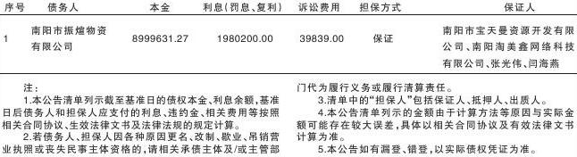 根据河南资产管理有限公司与张志攀签署的《资产转让协议》,河南资产管理有限公司已将其对下列债务人及其担保人享有的主债权及担保合同项下的全部权利,依法转让给张志攀。河南资产管理有限公司与张志攀联合公告通知各债务人及担保人以及其他相关各方。 张志攀作为上述债权的受让方,现公告要求公告清单中所列包括但不限于借款人、担保人及其相关承债主体、清算主体等相关当事人,从公告之日起立即向张志攀履行主债权合同及担保合同约定的偿付义务或相应的担保责任。 特此公告。 河南资产管理有限公司 张志攀 2020年7月16日 河南资产管理有限公司联系人:宋先生 联系电话:0371-56826656 住所地:郑州市郑东新区商务外环路2号河南传媒大厦26层 张志攀 联系电话:15515759599 住所地:郑州市永平路19号 公告清单(基准日:2020年6月18日)单位:人民币元 |