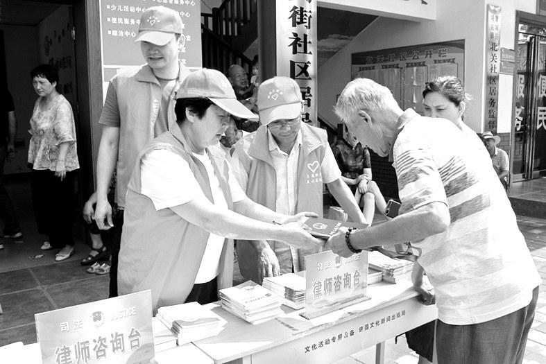7月20日,襄城县司法局组织法律援助律师、普法志愿者走进城关镇北关社区,开展送民法典知识进社区宣传活动。活动现场,工作人员挂起宣传横幅,设立咨询台,向社区干部群众免费发放民法典宣传手册,并现场解答群众的法律咨询。